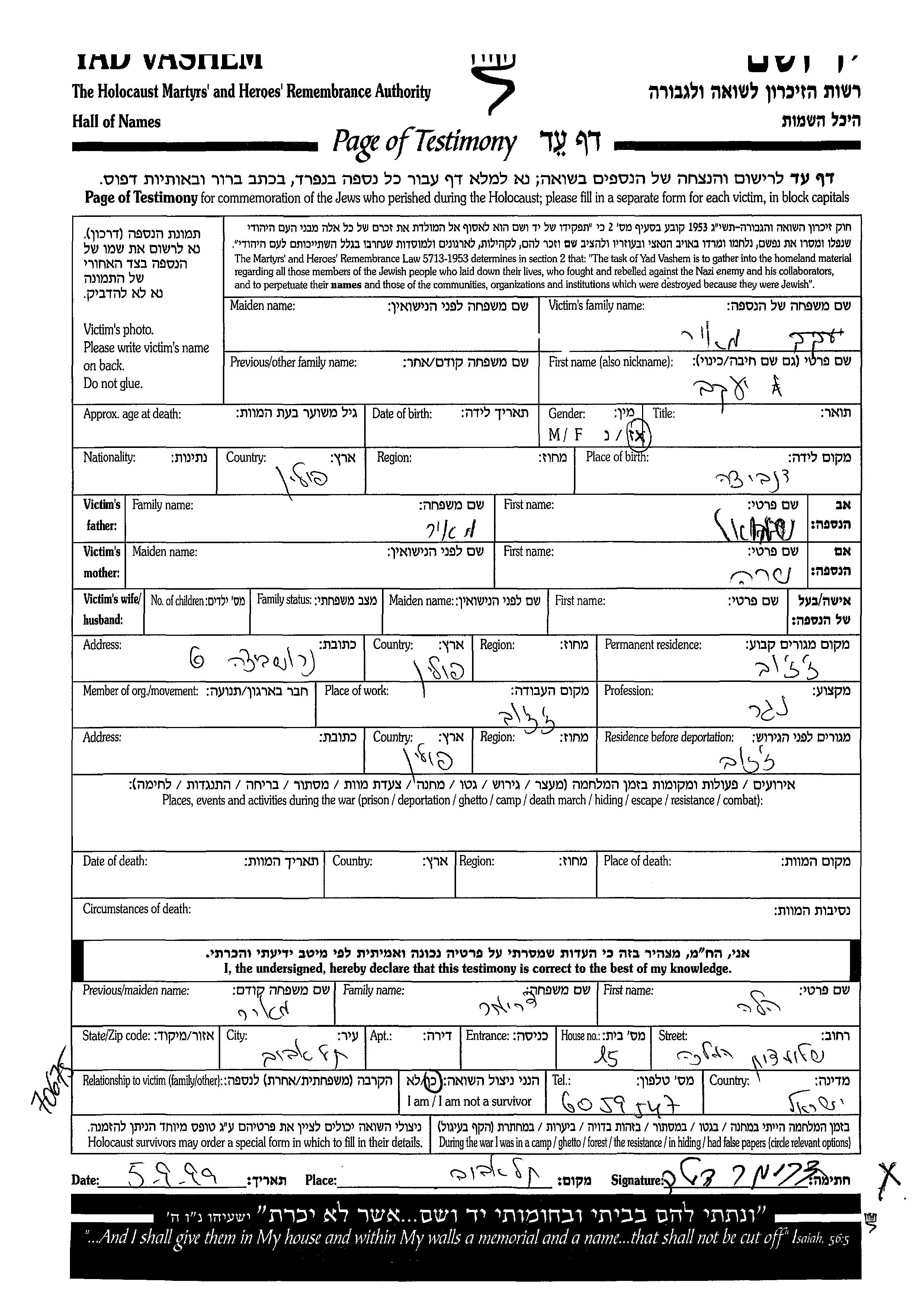 Yad Vashem - Pages of Testimony Names Memorial Collection
