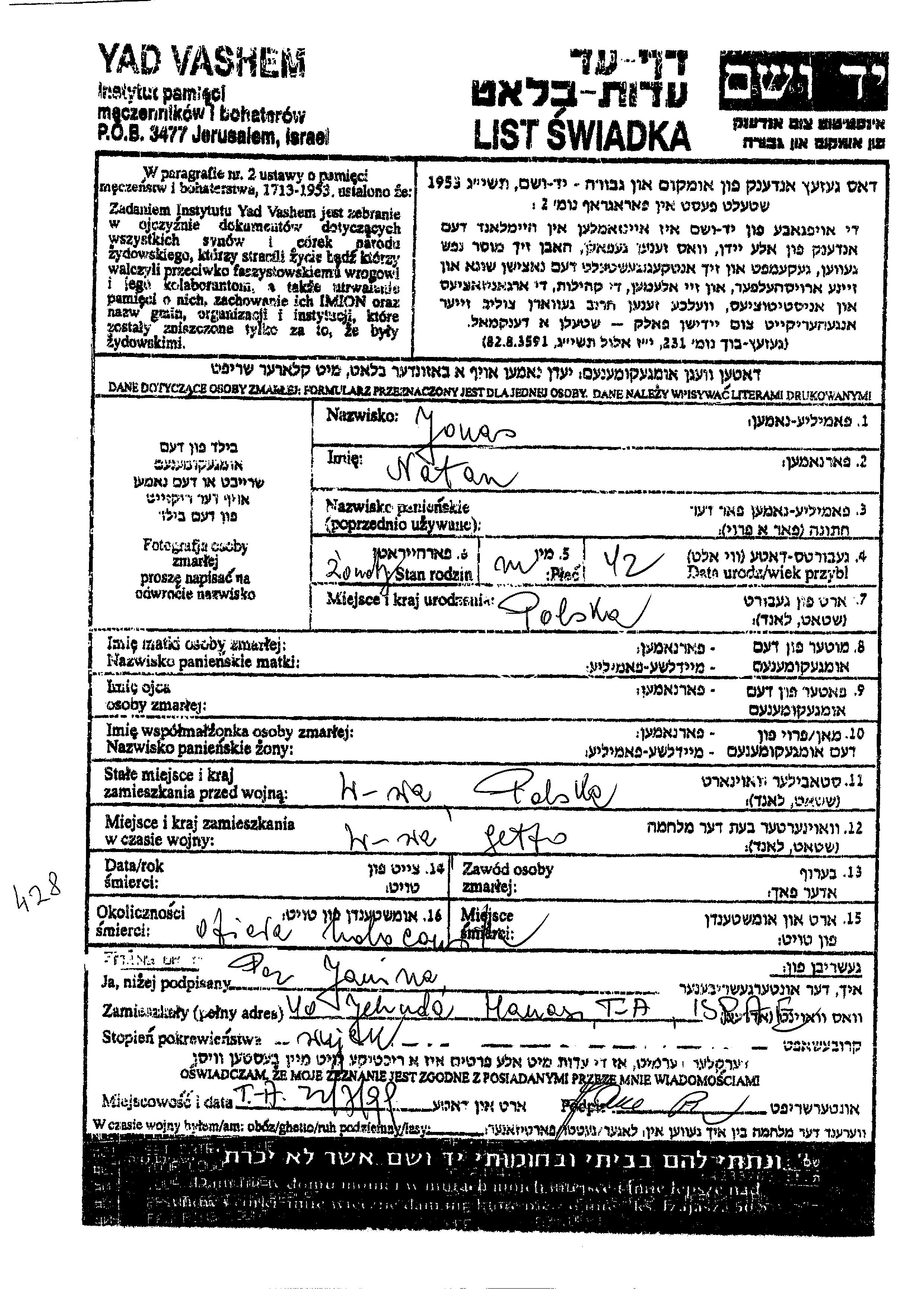 Jonas Natan Warszawa, Pologne Feuille de témoignage