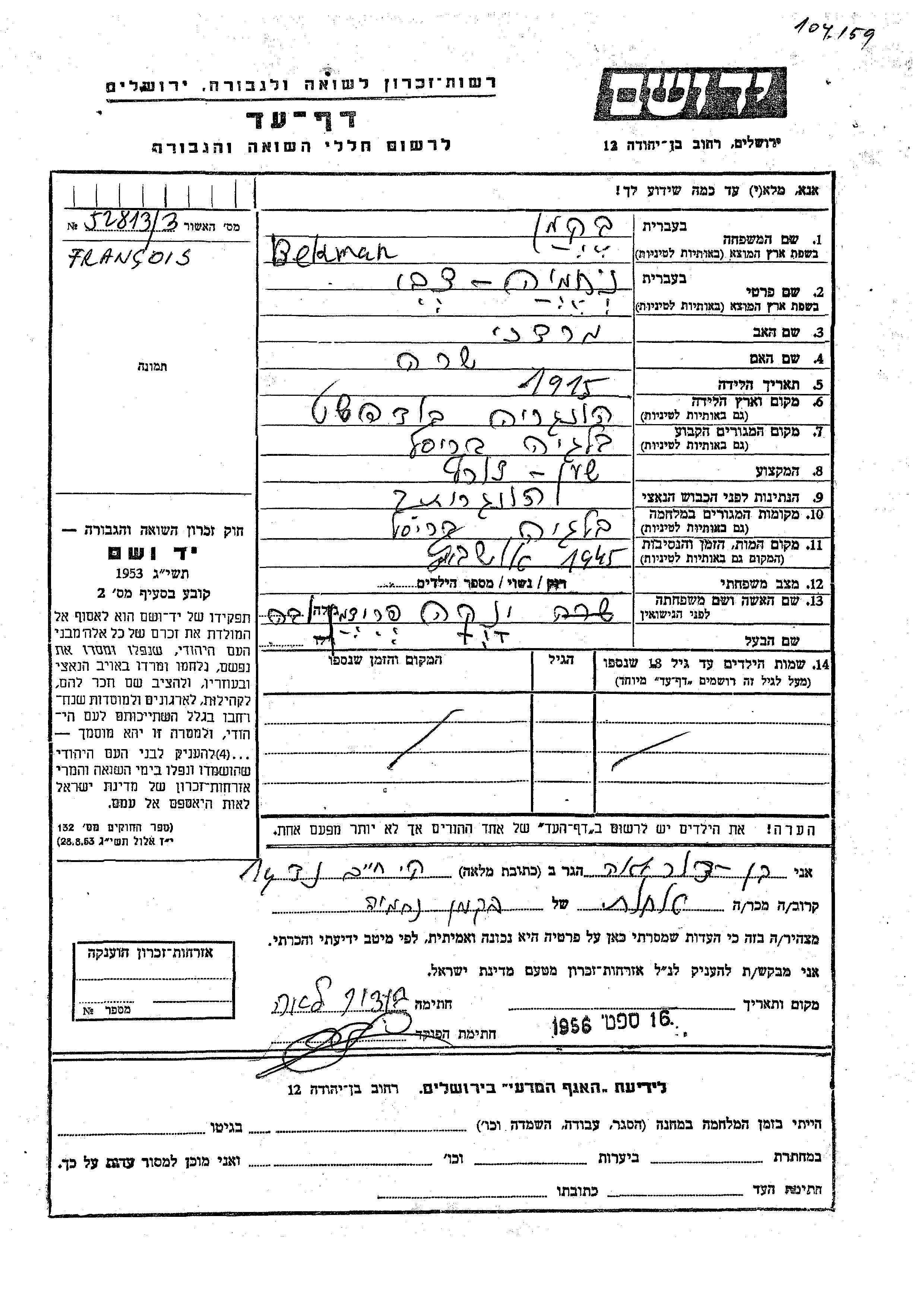 Bekman Nekhemia Tzvi 1915 Brussels, Belgique Feuille de témoignage