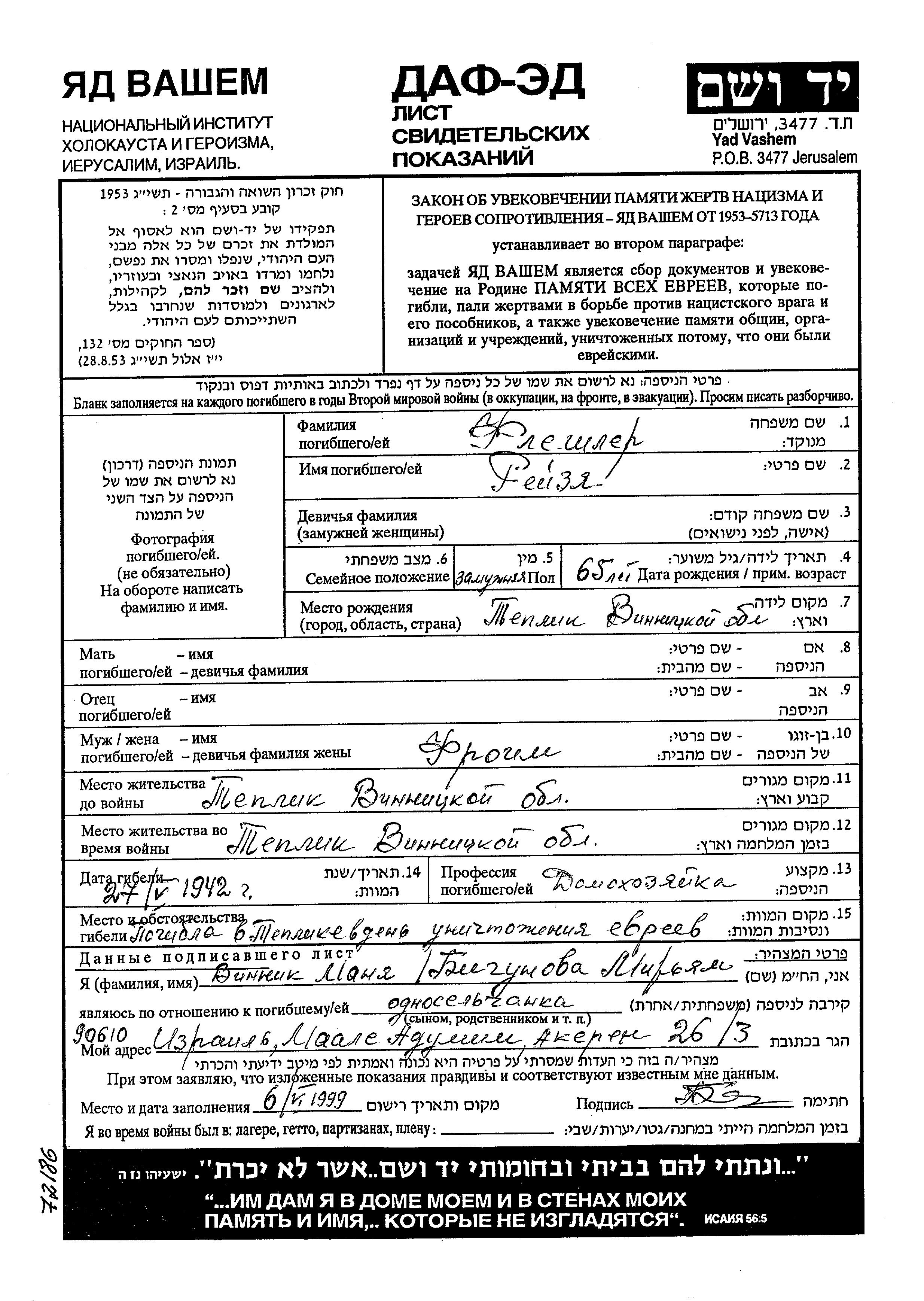 Reizya a été assassinée pendant la Shoah. Lieu de la mort: Teplik, Ukraine (URSS) en 1942.