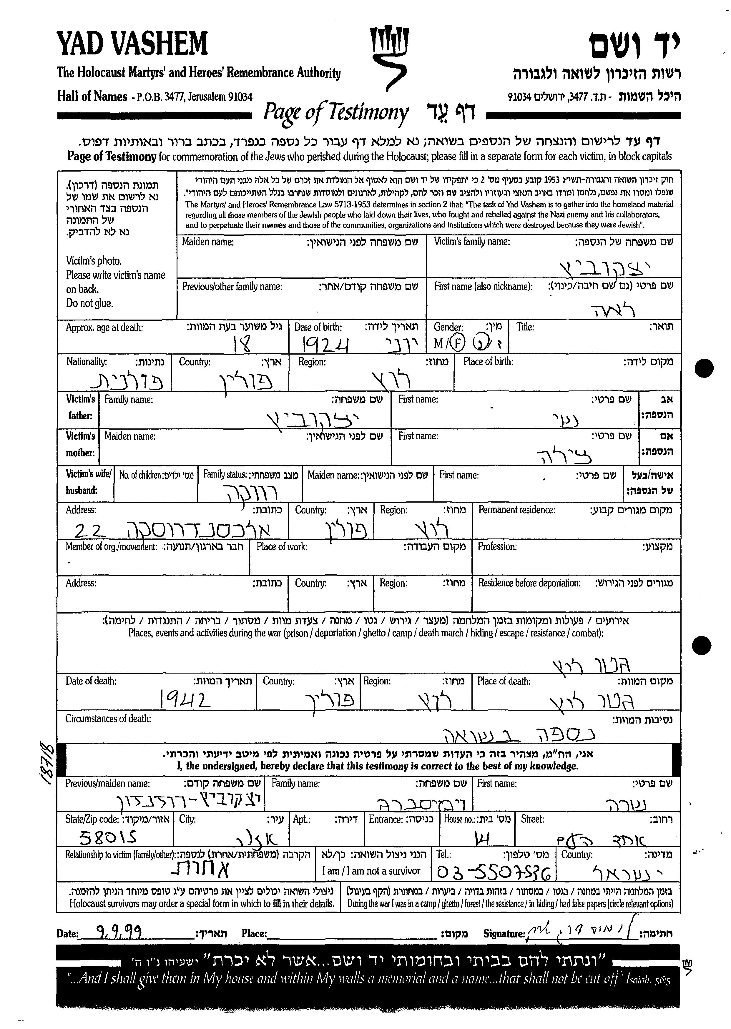 Yad Vashem - Pages of Testimony Names Memorial Collection