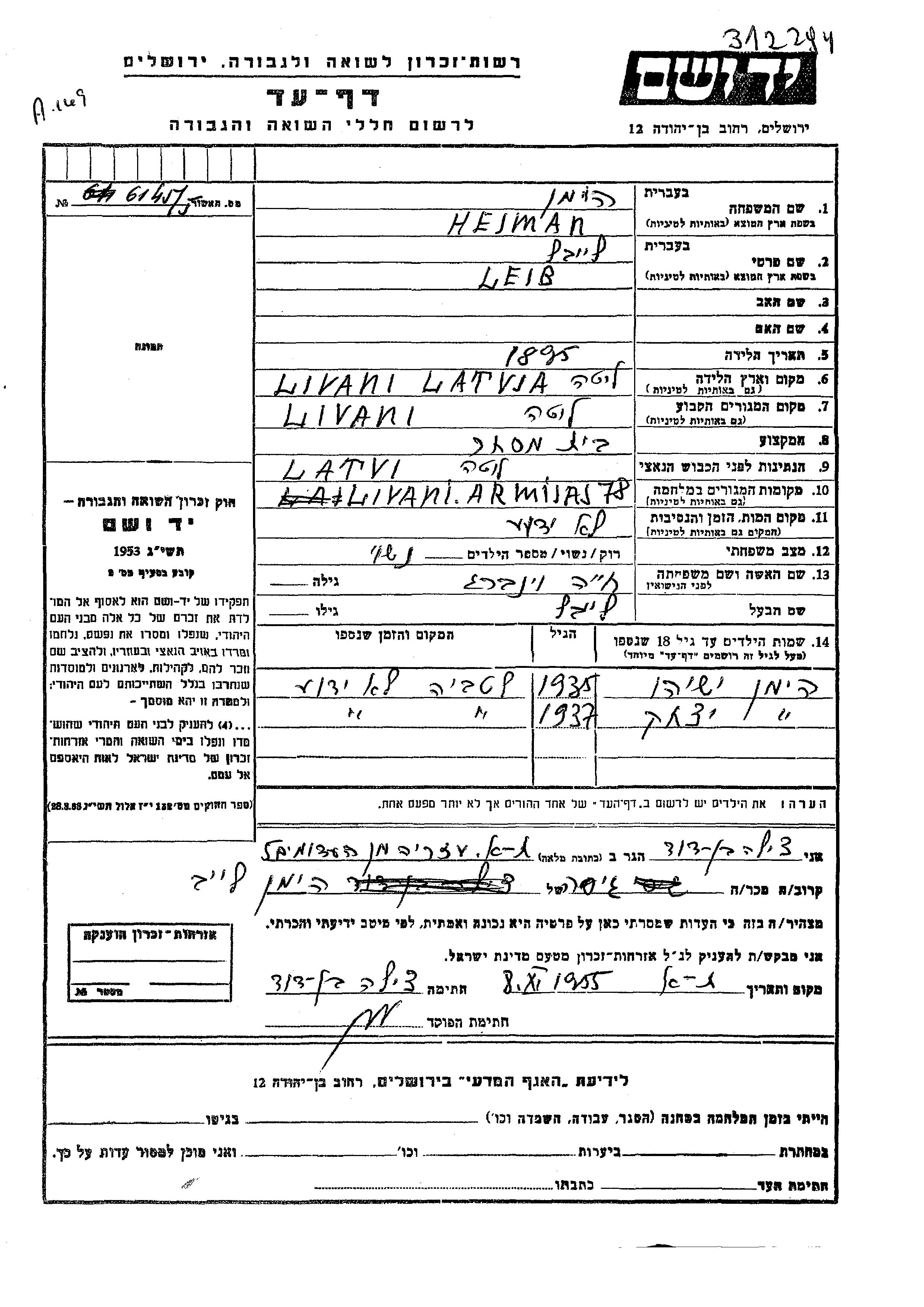 Heiman Leibel 1895 Livani, Lettonie Feuille de témoignage