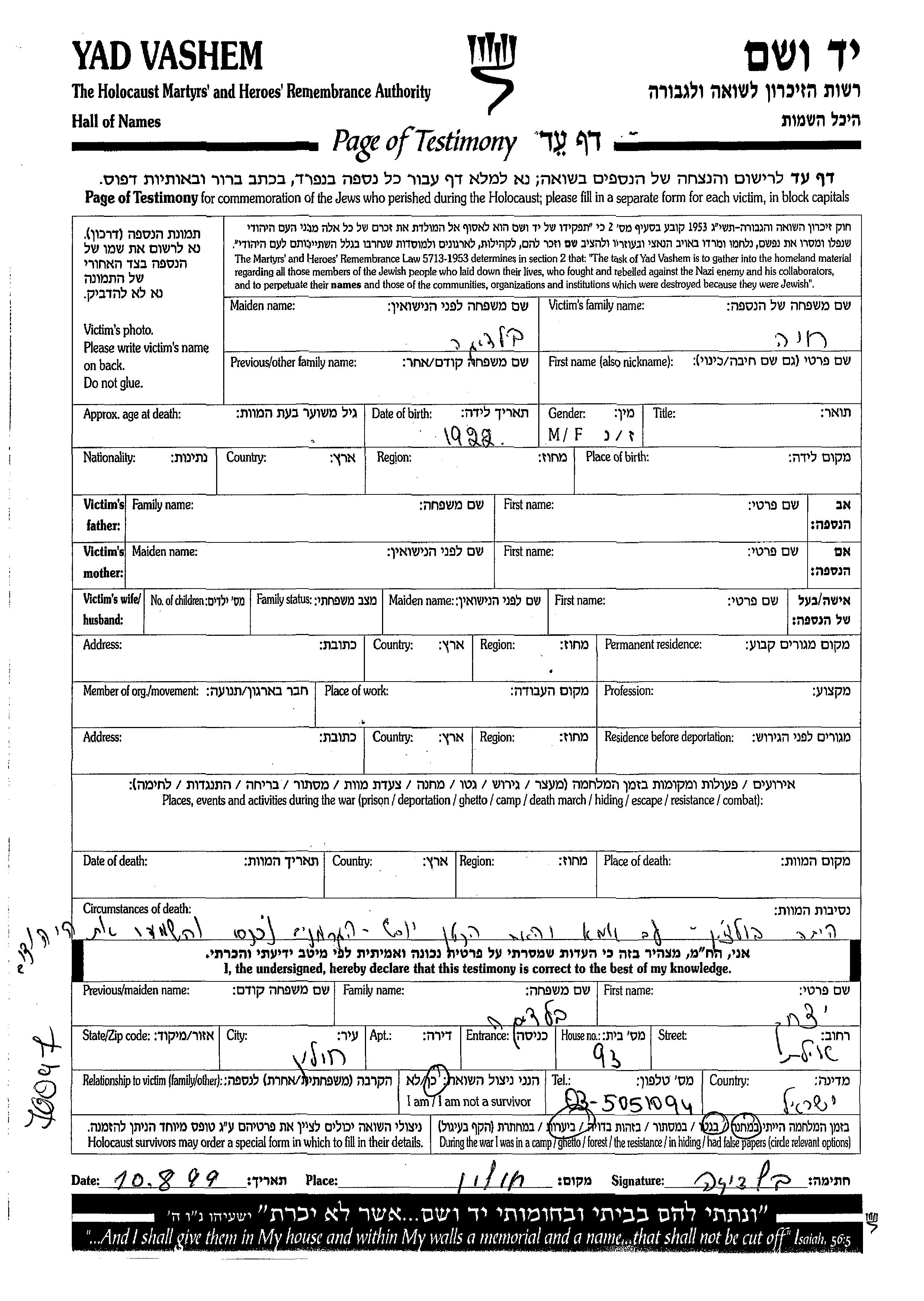 Yad Vashem - Pages of Testimony Names Memorial Collection