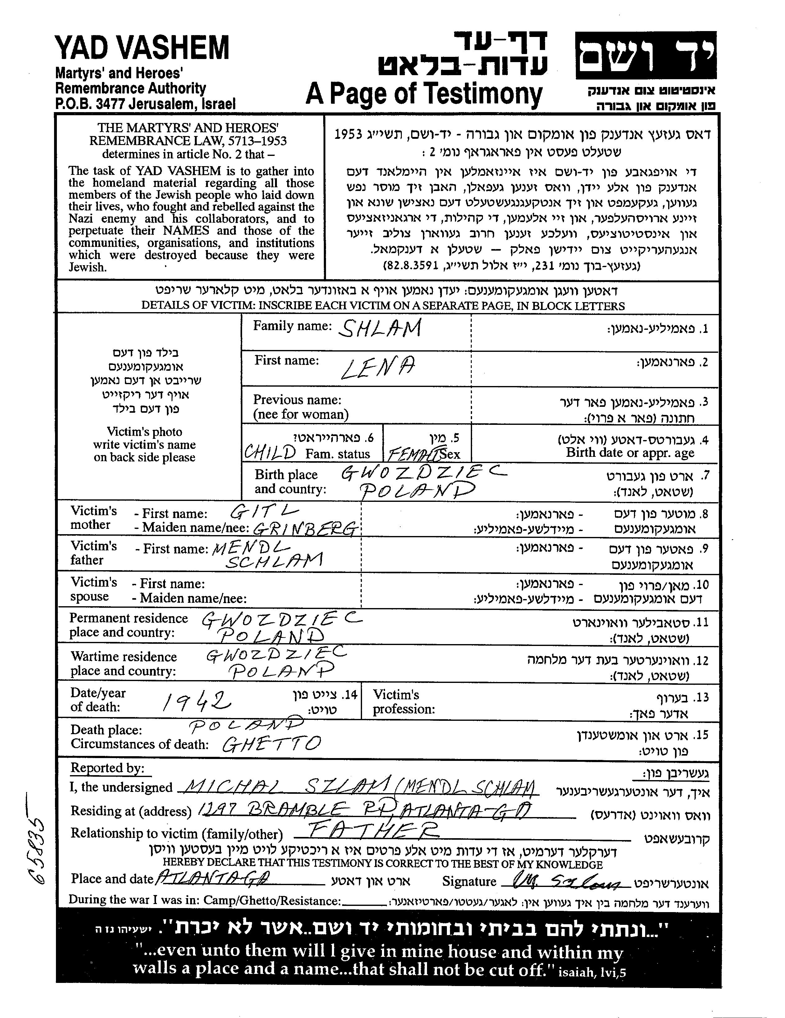 Shlam Lena Gwozdziec, Pologne Feuille de témoignage