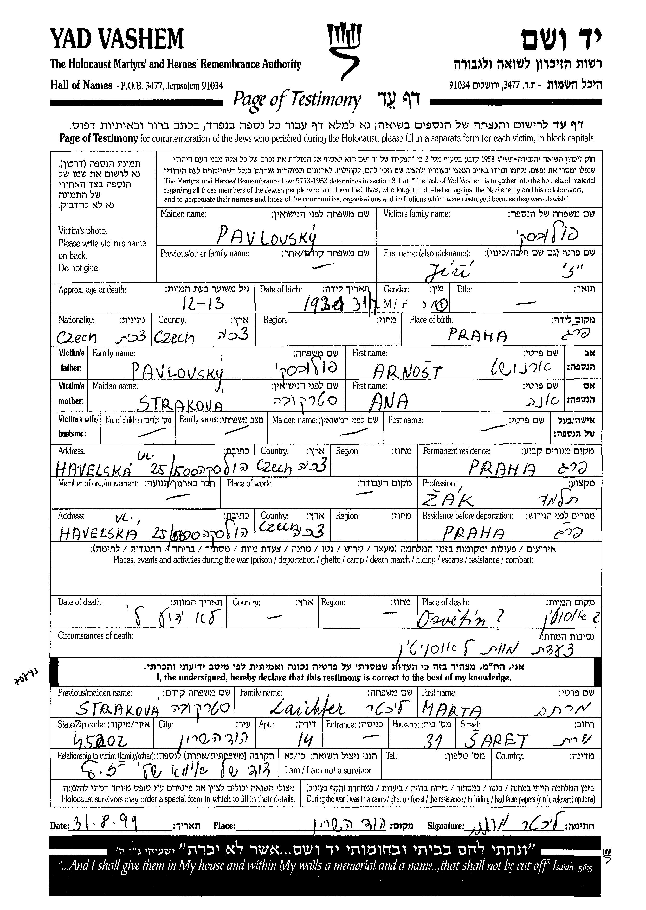 Yad Vashem - Pages of Testimony Names Memorial Collection