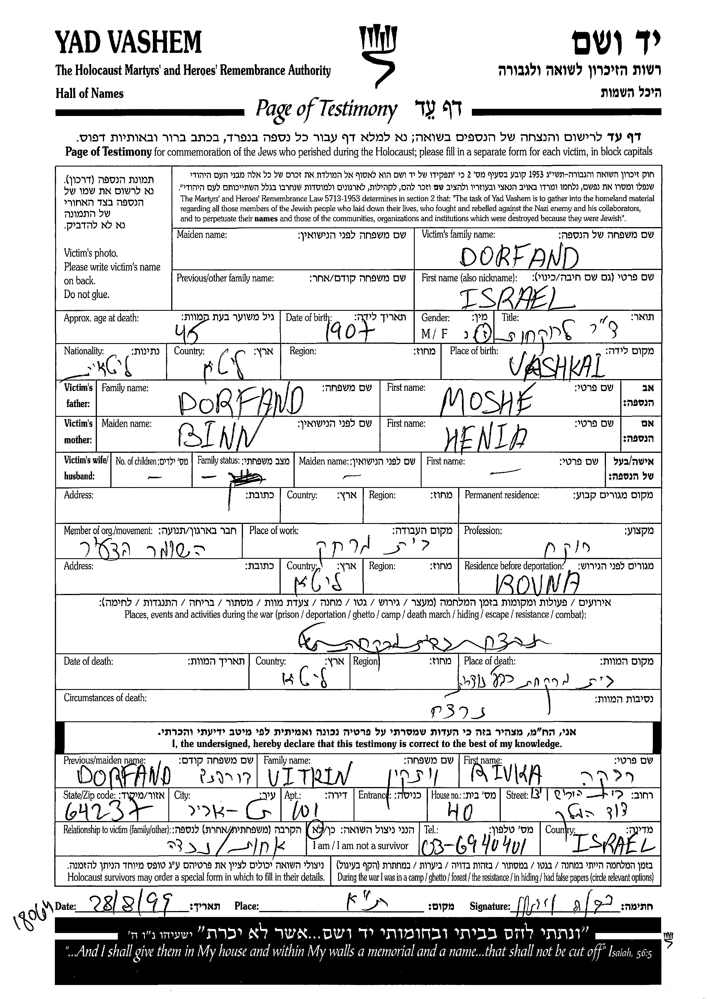 Dorfand Israel 1907 endroit inconnu, Feuille de témoignage
