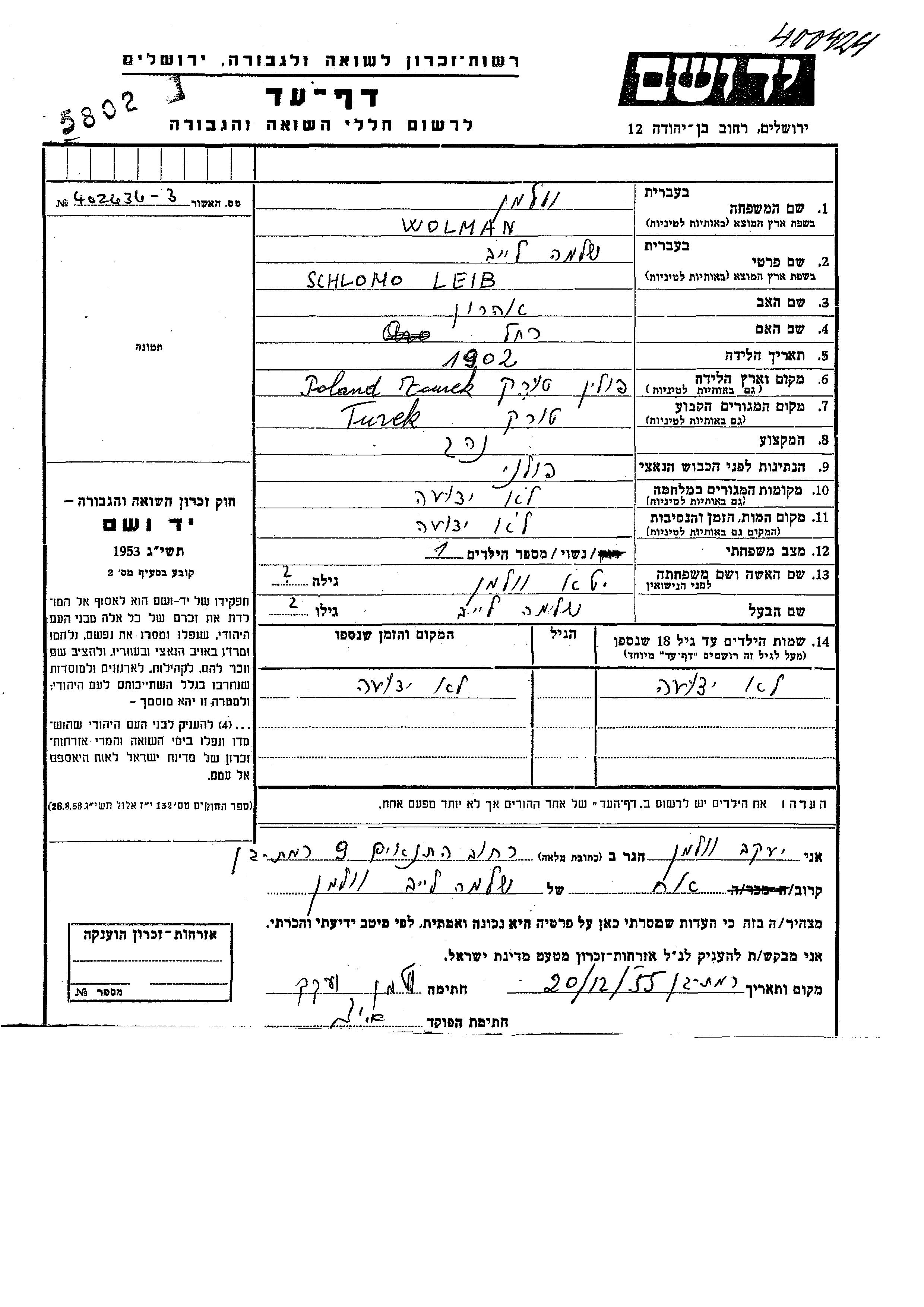 Wolman Schlomo Leib 1902 Turek, Pologne Feuille de témoignage