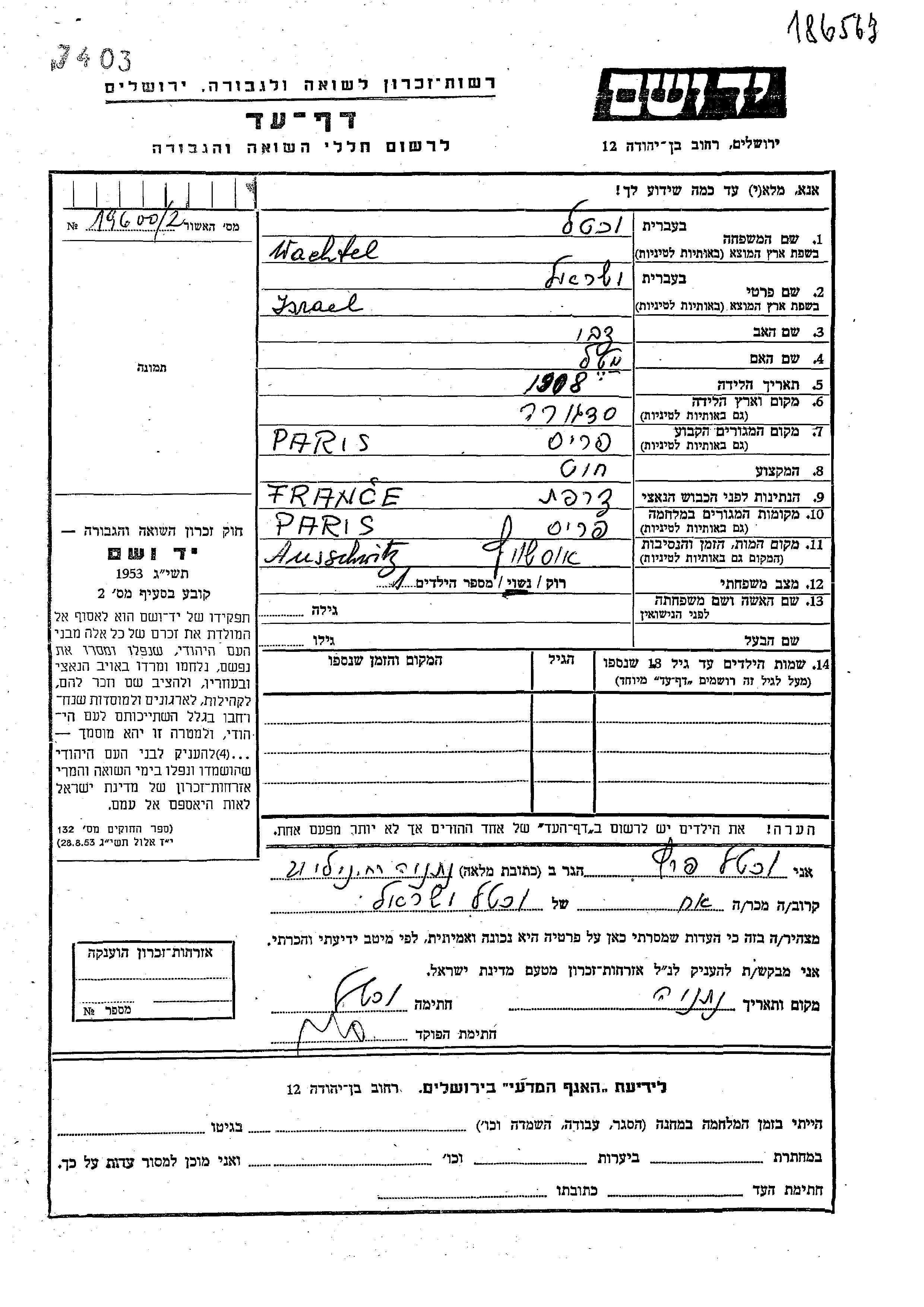 Wachtel Israel 1908 Paris, France Feuille de témoignage