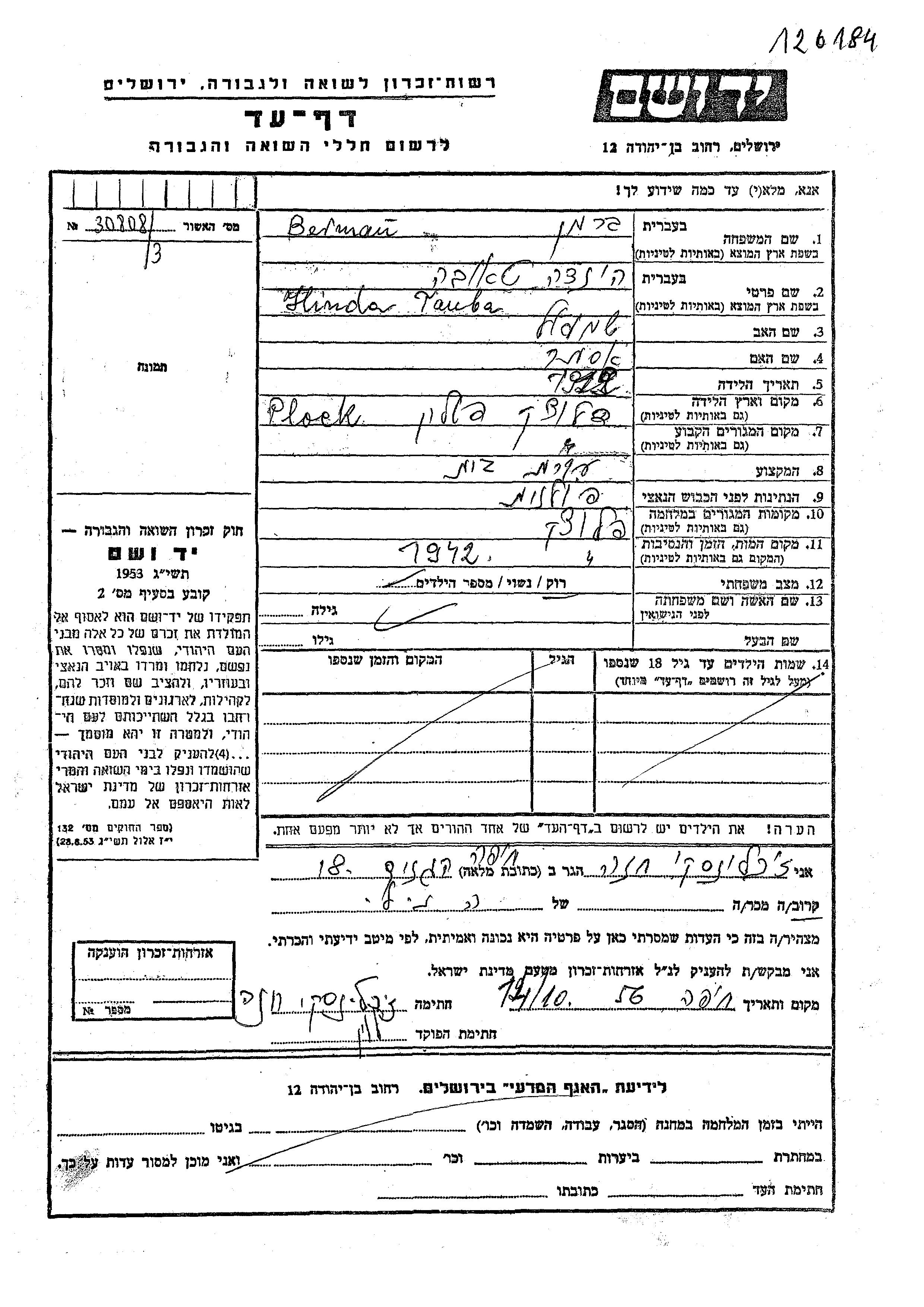 Berman Hinda Tauba 1910 Plock, Pologne Feuille de témoignage