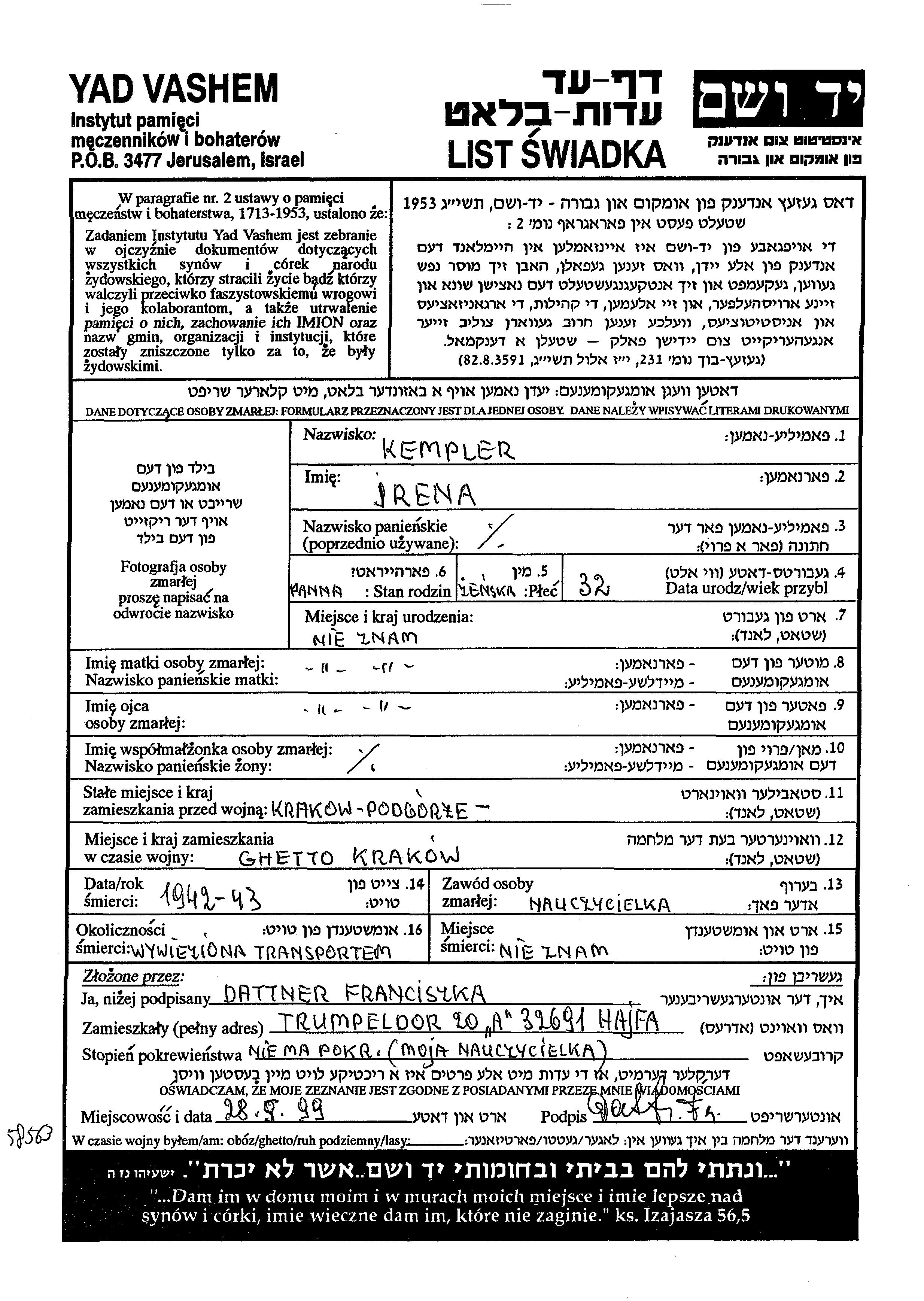 Kempler Irena Krakow, Pologne Feuille de témoignage