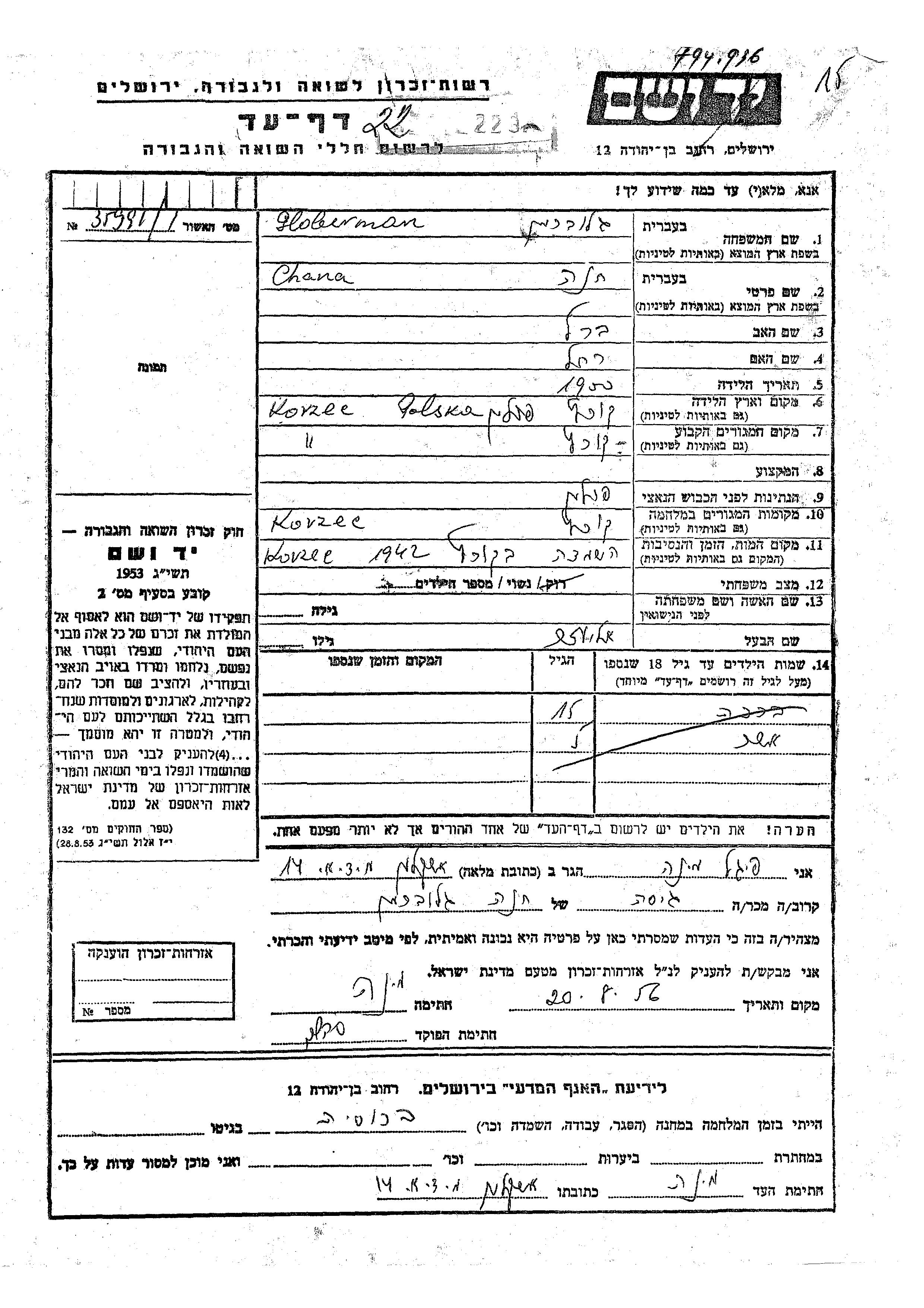 Globerman Chana 1900 Korzec, Pologne Feuille de témoignage