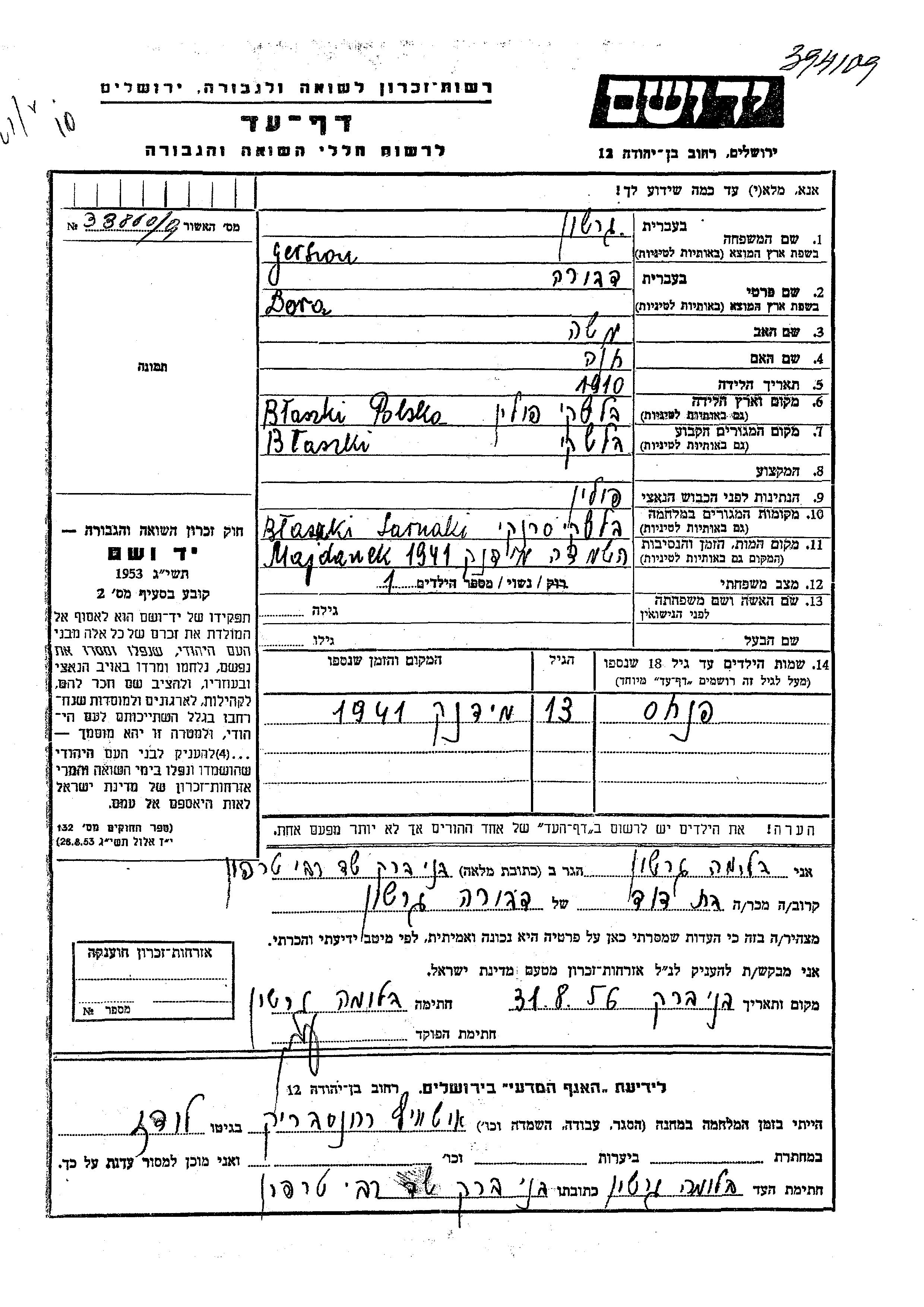 Gerszon Dora Dvora 1910 Blaszki, Pologne Feuille de témoignage