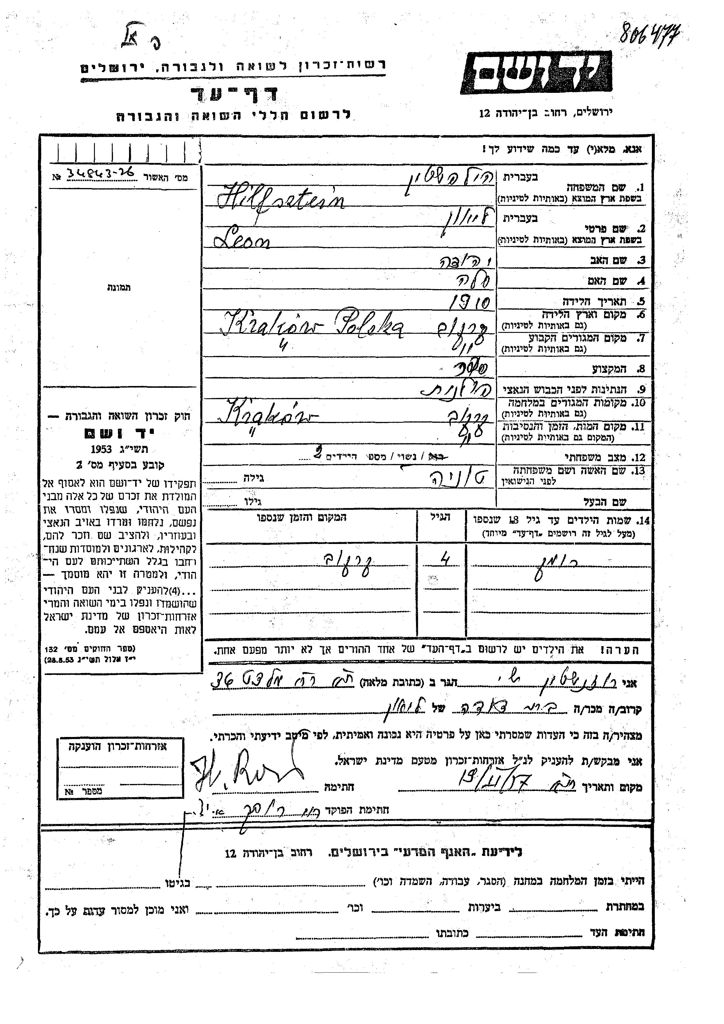 Lion Hilfsztein est né à Krakow, Pologne en 1910, fils de Yehuda et de Sala. Il était Coiffeur/coiffeuse et Mariée à Tonia. Avant la seconde guerre mondiale il vivait à Krakow, Pologne. Au cours de la guerre, il était à Krakow, Pologne.