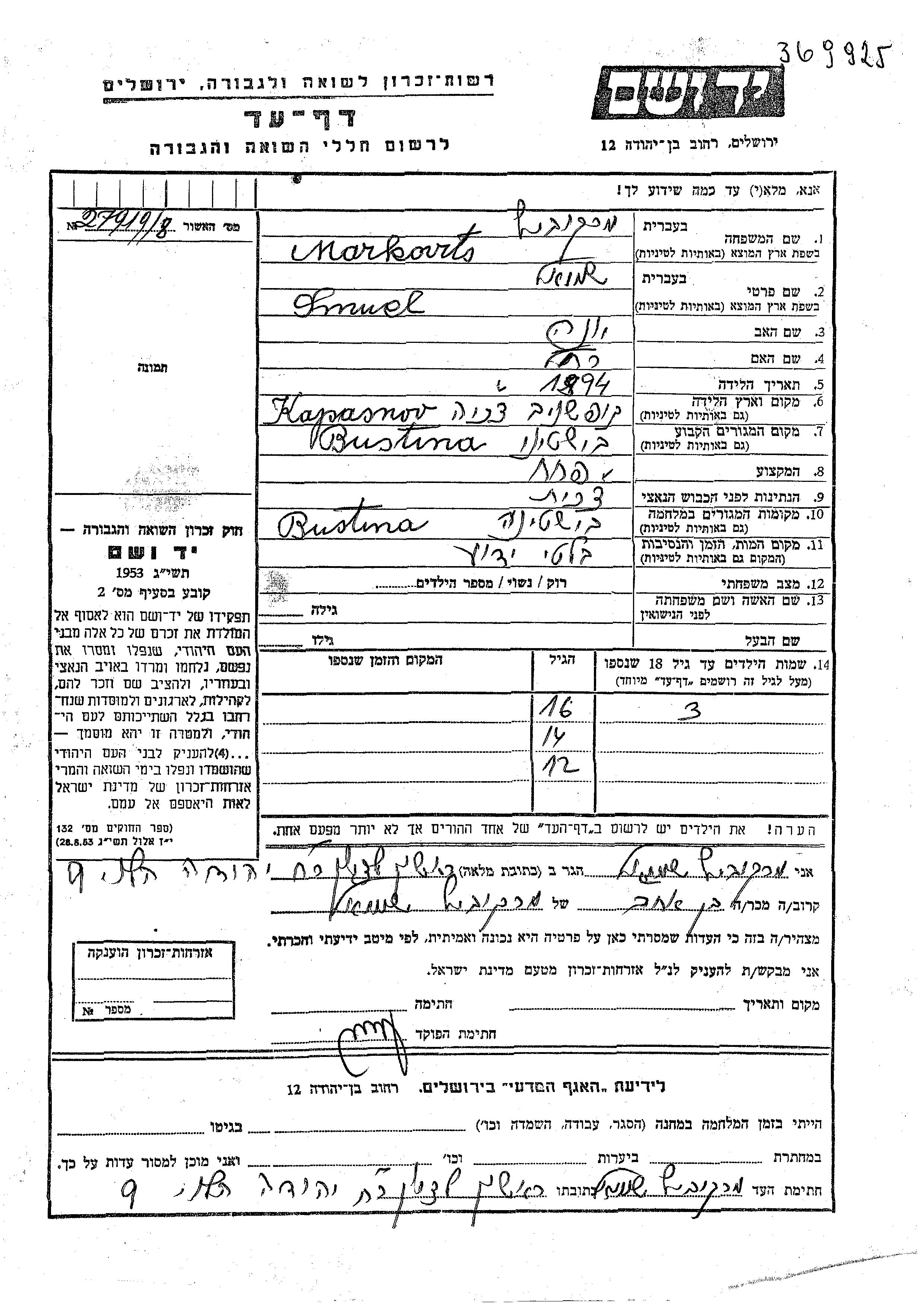 Markovits Smuel 1894 Bustina, Tchécoslovaquie Feuille de témoignage