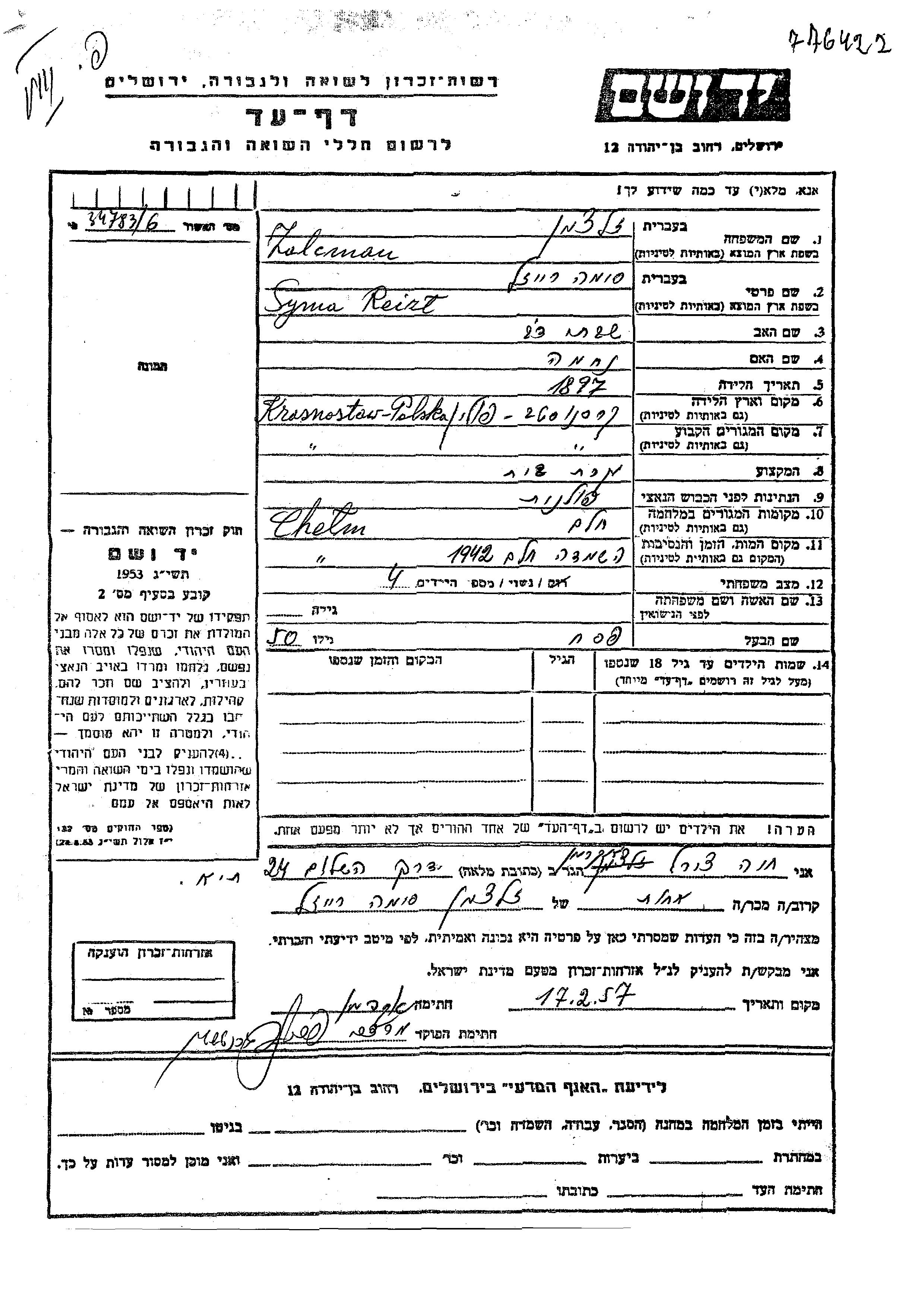 Zalcman Syma Reizl 1897 Krasnistav, Pologne Feuille de témoignage