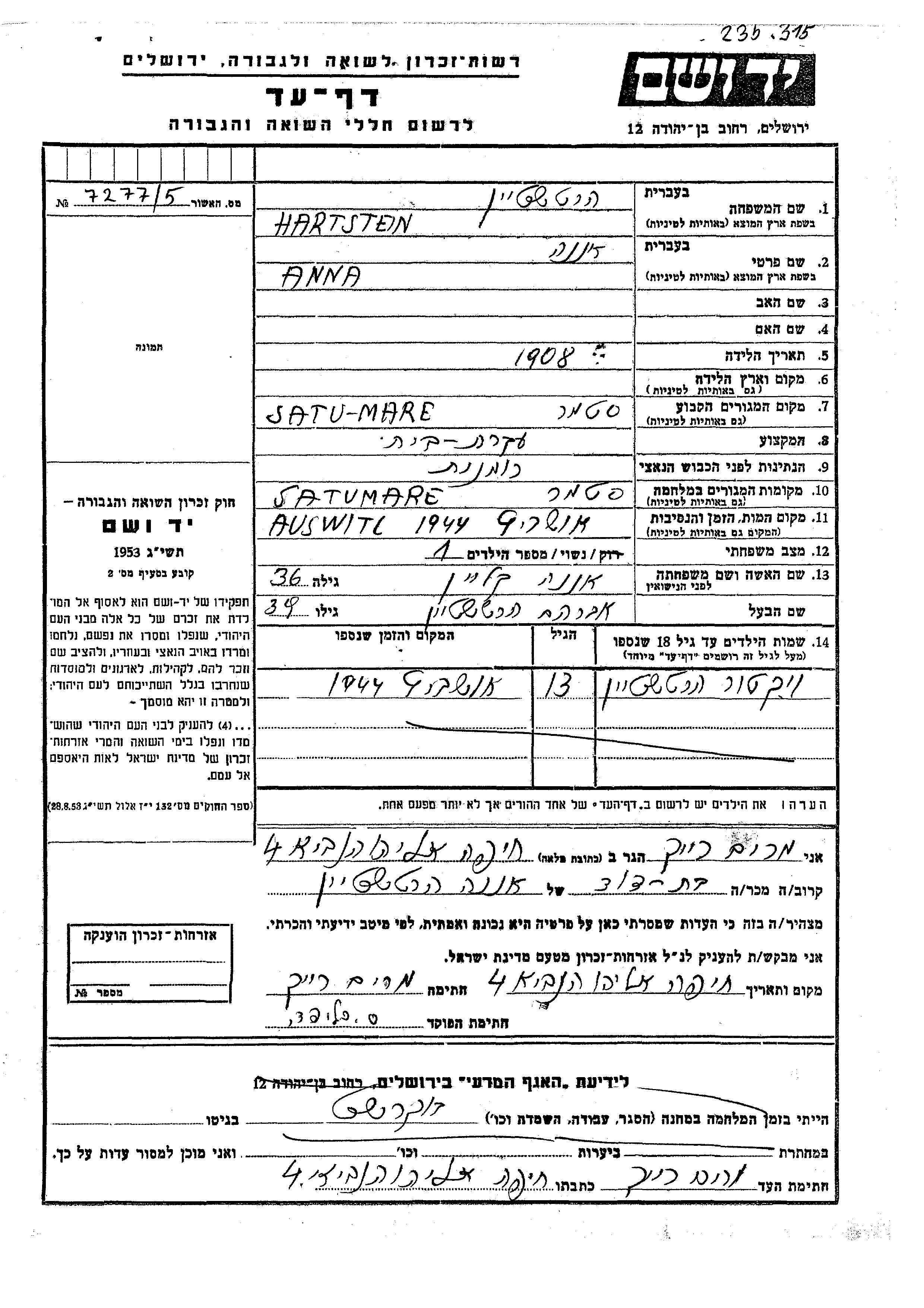 Hartstein Anna 1908 Satu Mare, Roumanie Feuille de témoignage