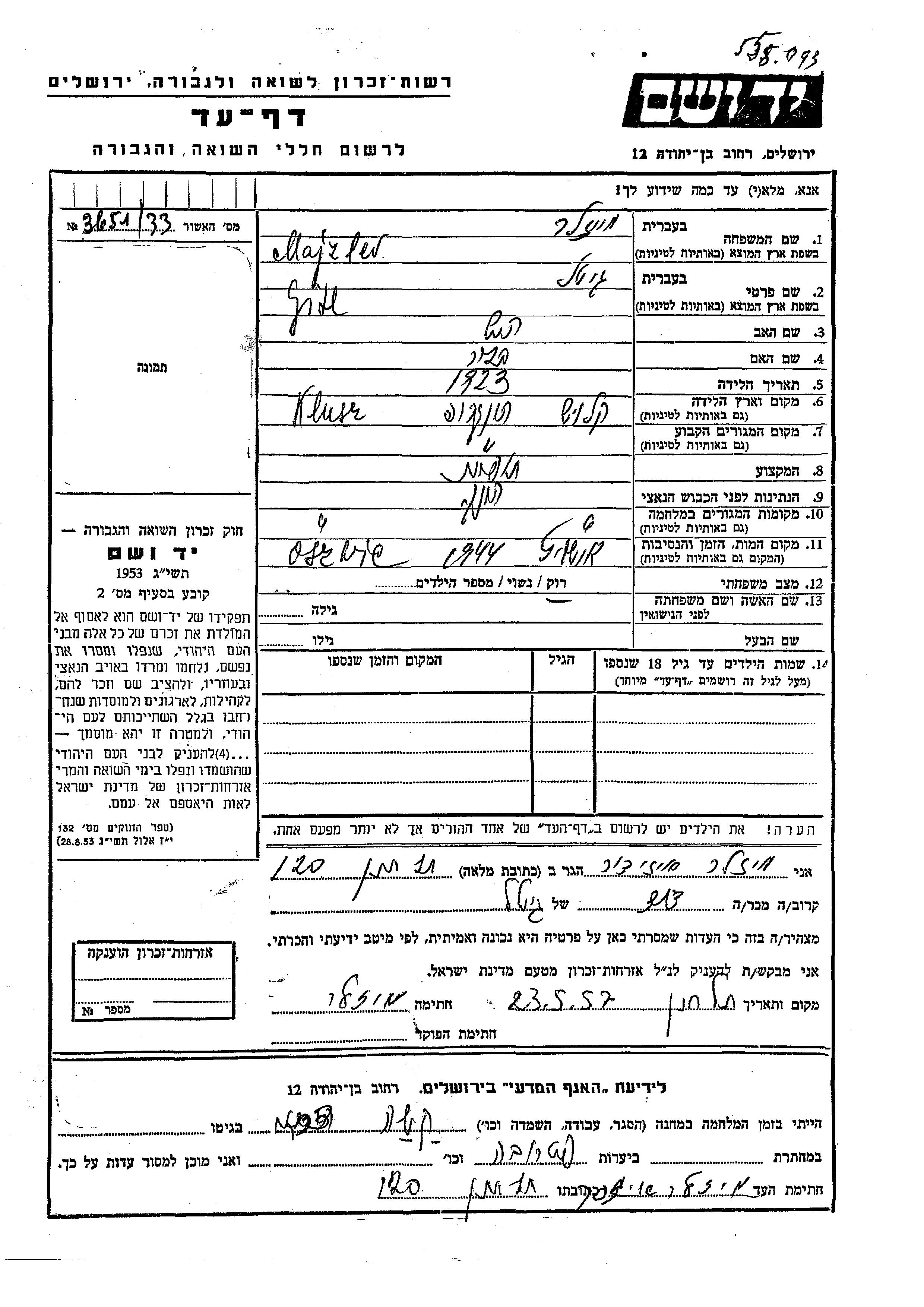 Majzler Gitl 1923 Klusz, Feuille de témoignage