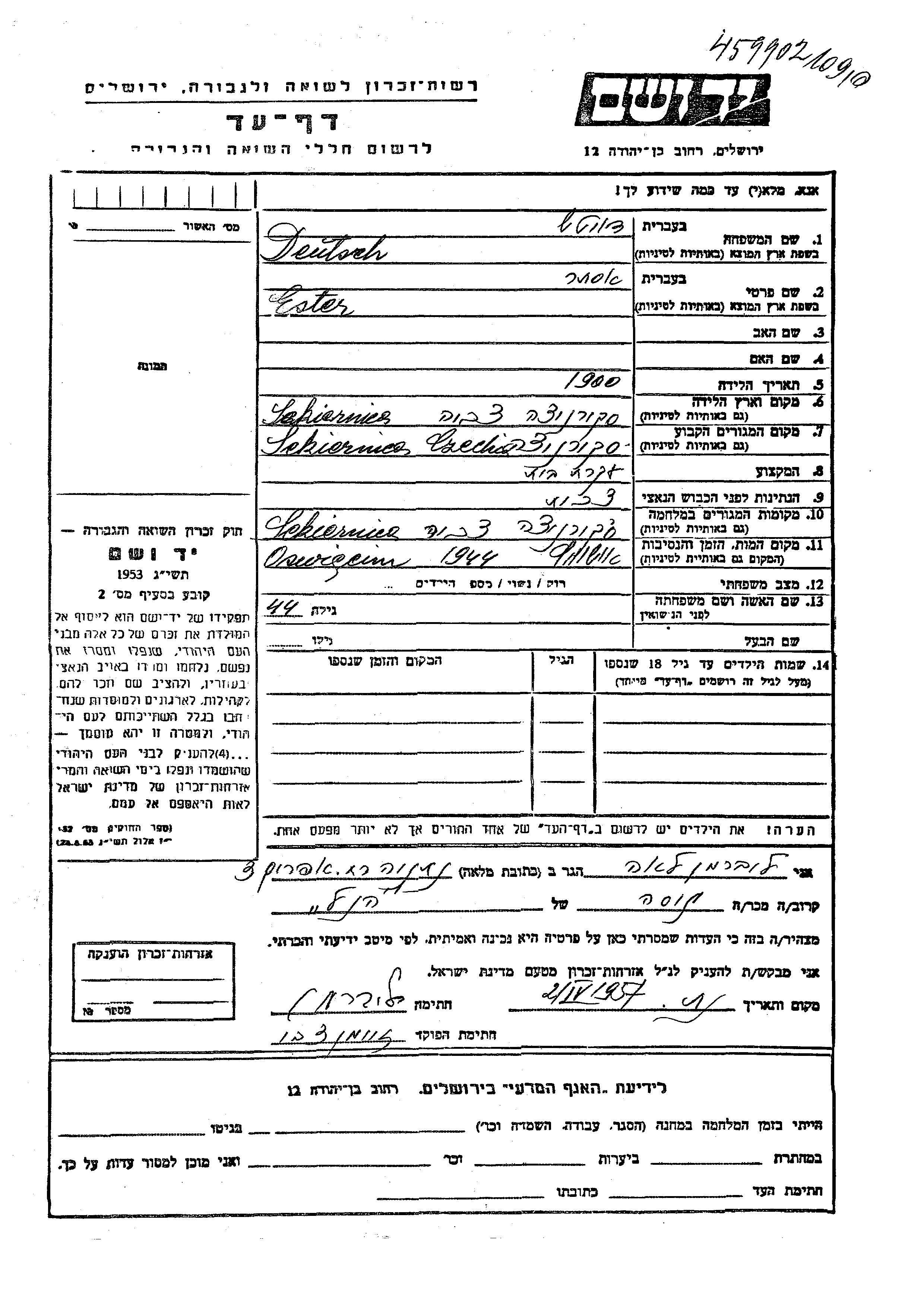 Ester Deutsch est née à Sekiernica, Tchécoslovaquie en 1900. Elle était Femme au foyer. Avant la seconde guerre mondiale elle vivait à Sekiernica, Tchécoslovaquie. Pendant la guerre, elle était à Sekiernica, Tchécoslovaquie.