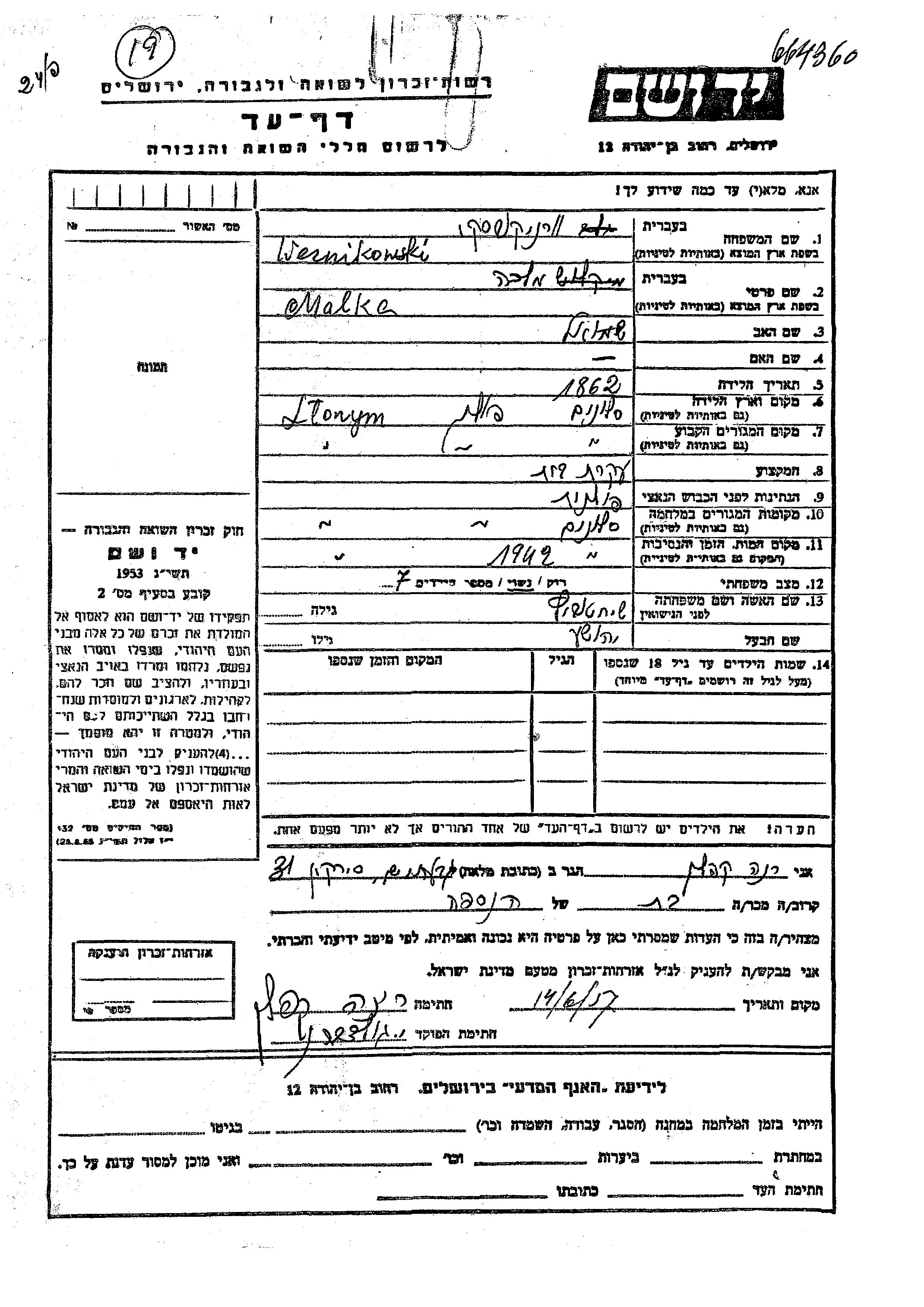 Malka Wernikowski née Sheikhatovich est née à Slonim, Pologne en 1862, fille de Shmuel. Elle était Femme au foyer et Mariée à Yehoshua. Avant la seconde guerre mondiale elle vivait à Slonim, Pologne. Pendant la guerre, elle était à Slonim, Pologne.