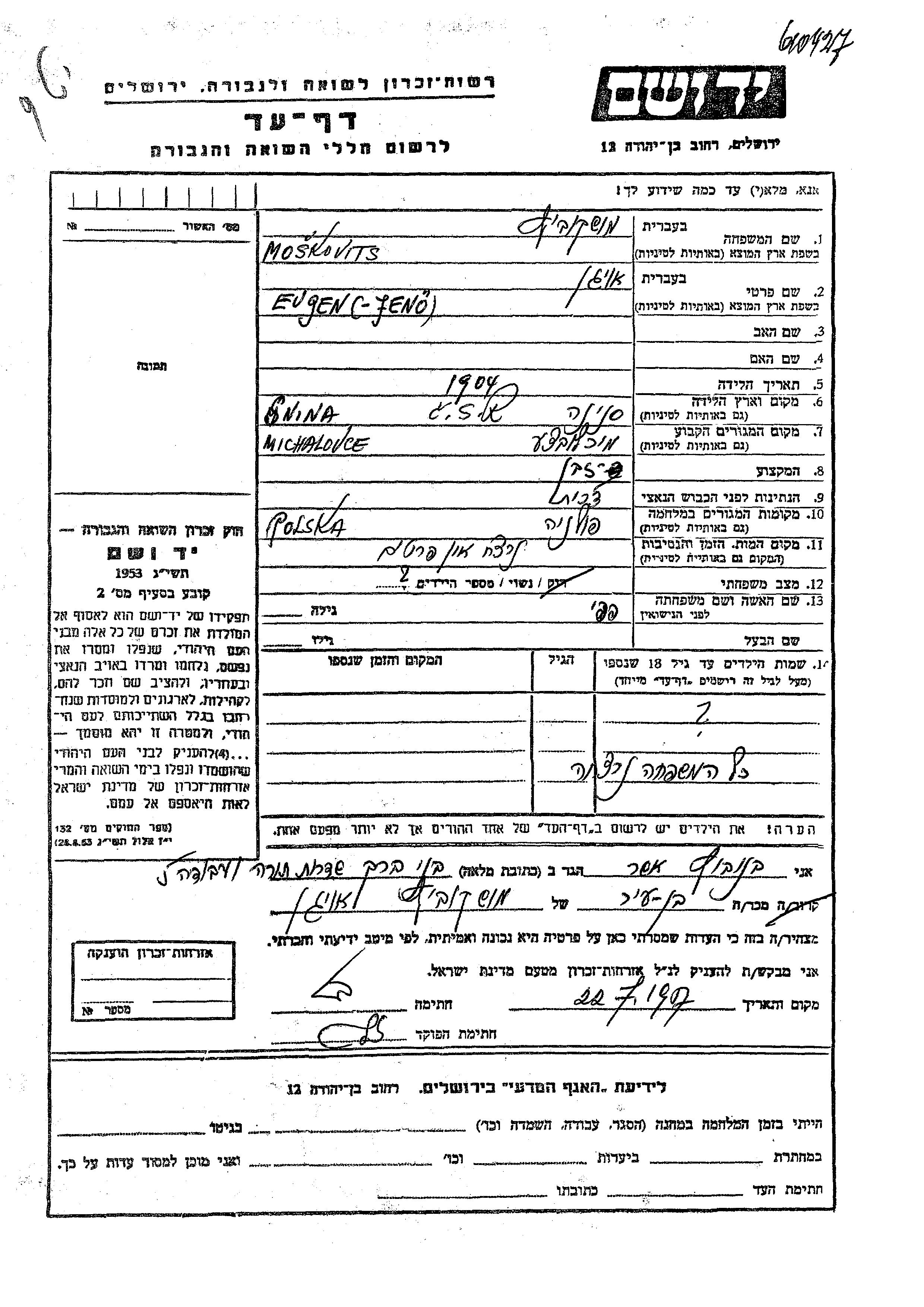 Moskovitz Jeno Oigen 1904 Michalovce, Tchécoslovaquie Feuille de témoignage