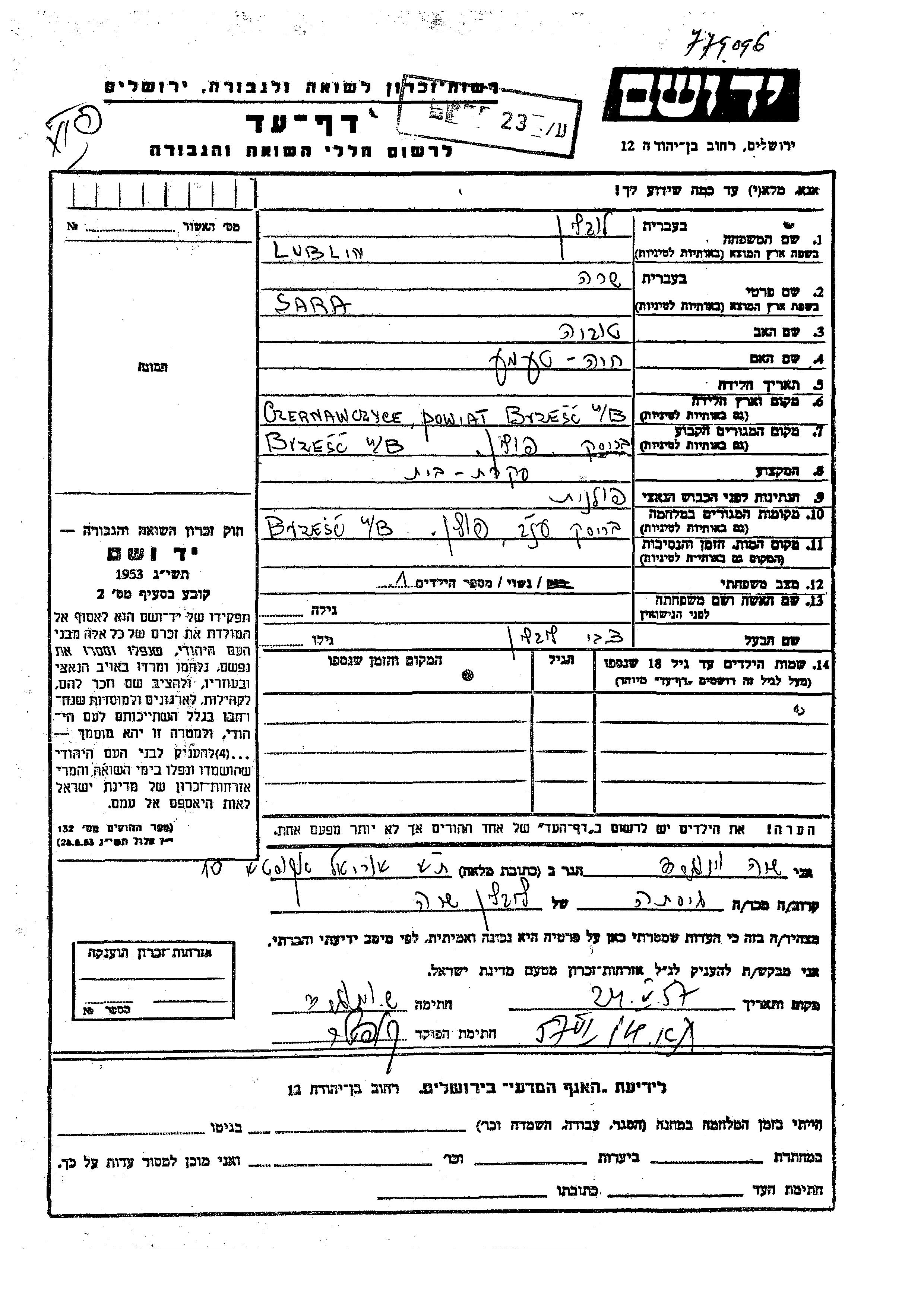 Lublin Sara Bresc Litewski, Pologne Feuille de témoignage