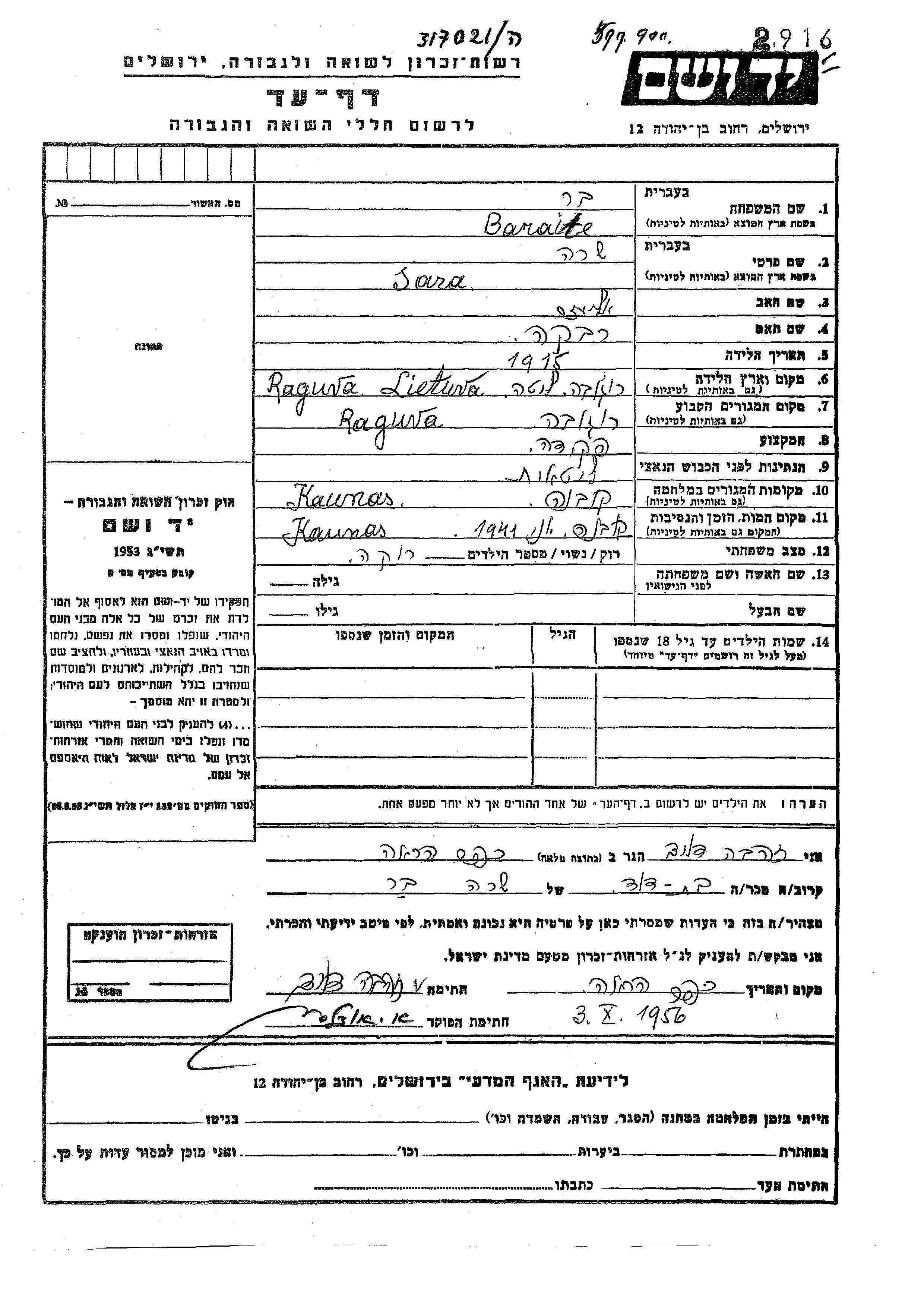 Baraite Ber Sara 1915 Raguva, Lituanie Feuille de témoignage