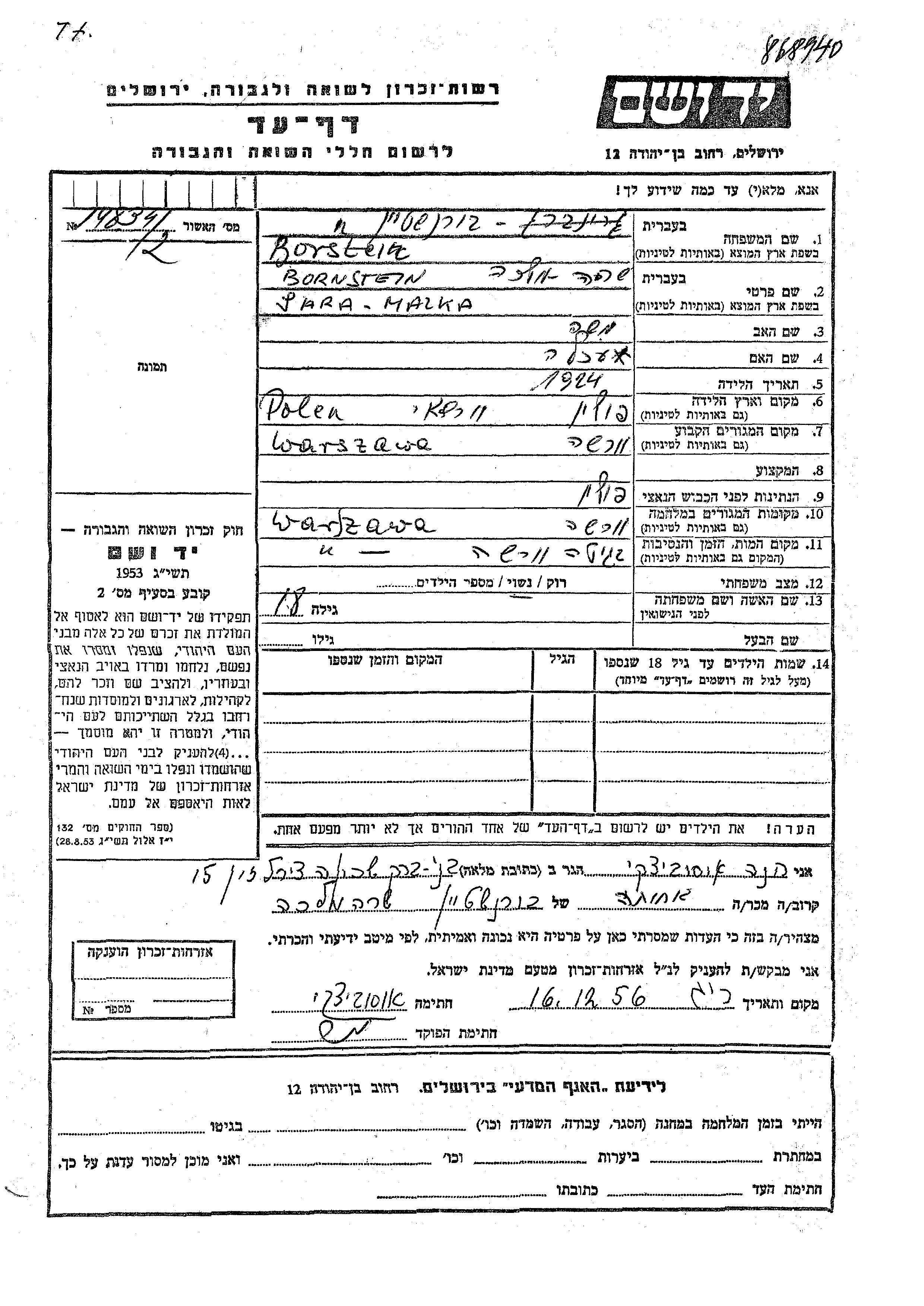 Bornstein Borstein Sara Malka 1924 Warszawa, Pologne Feuille de témoignage