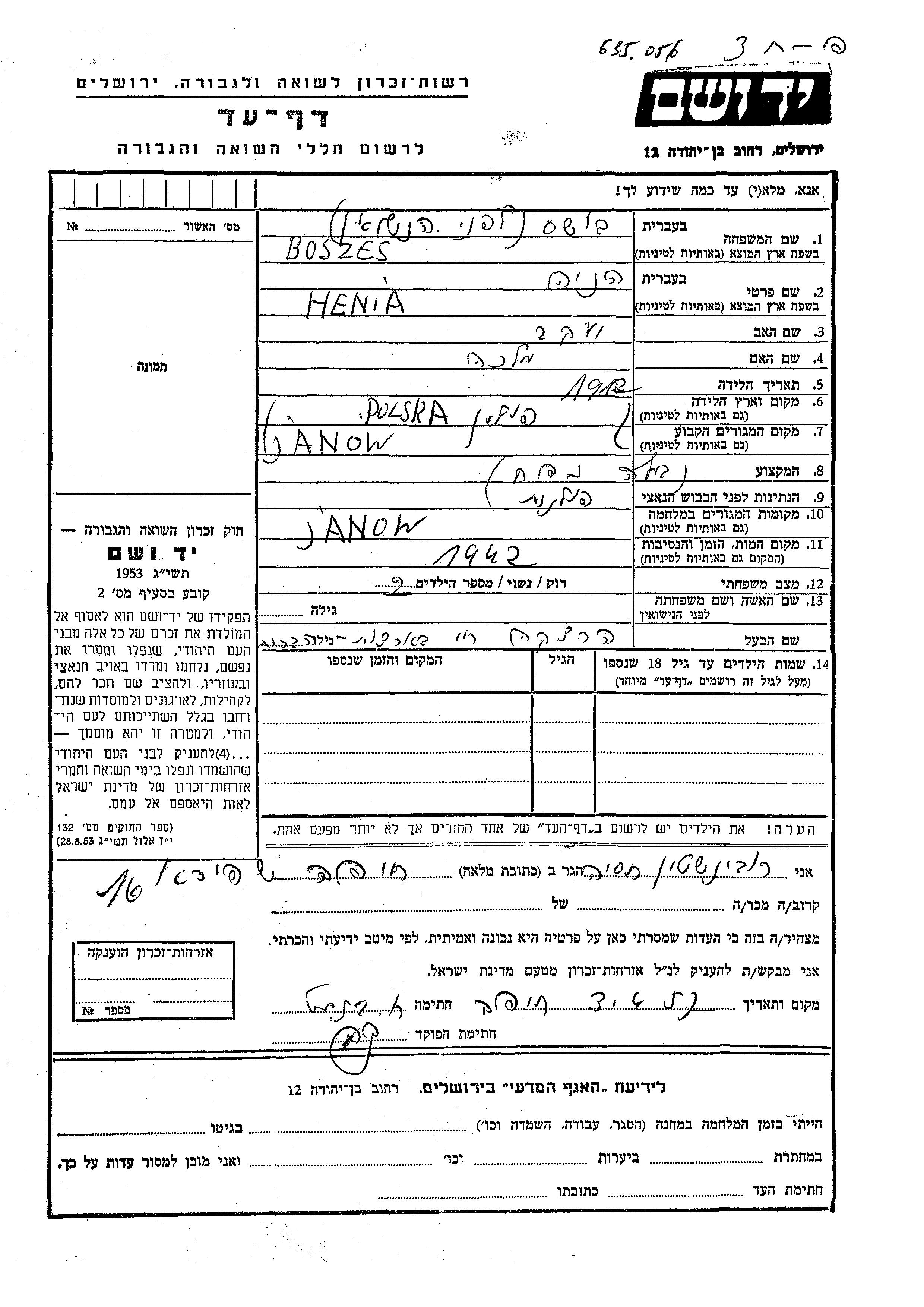 Boszes Henia 1912 Janow, Pologne Feuille de témoignage