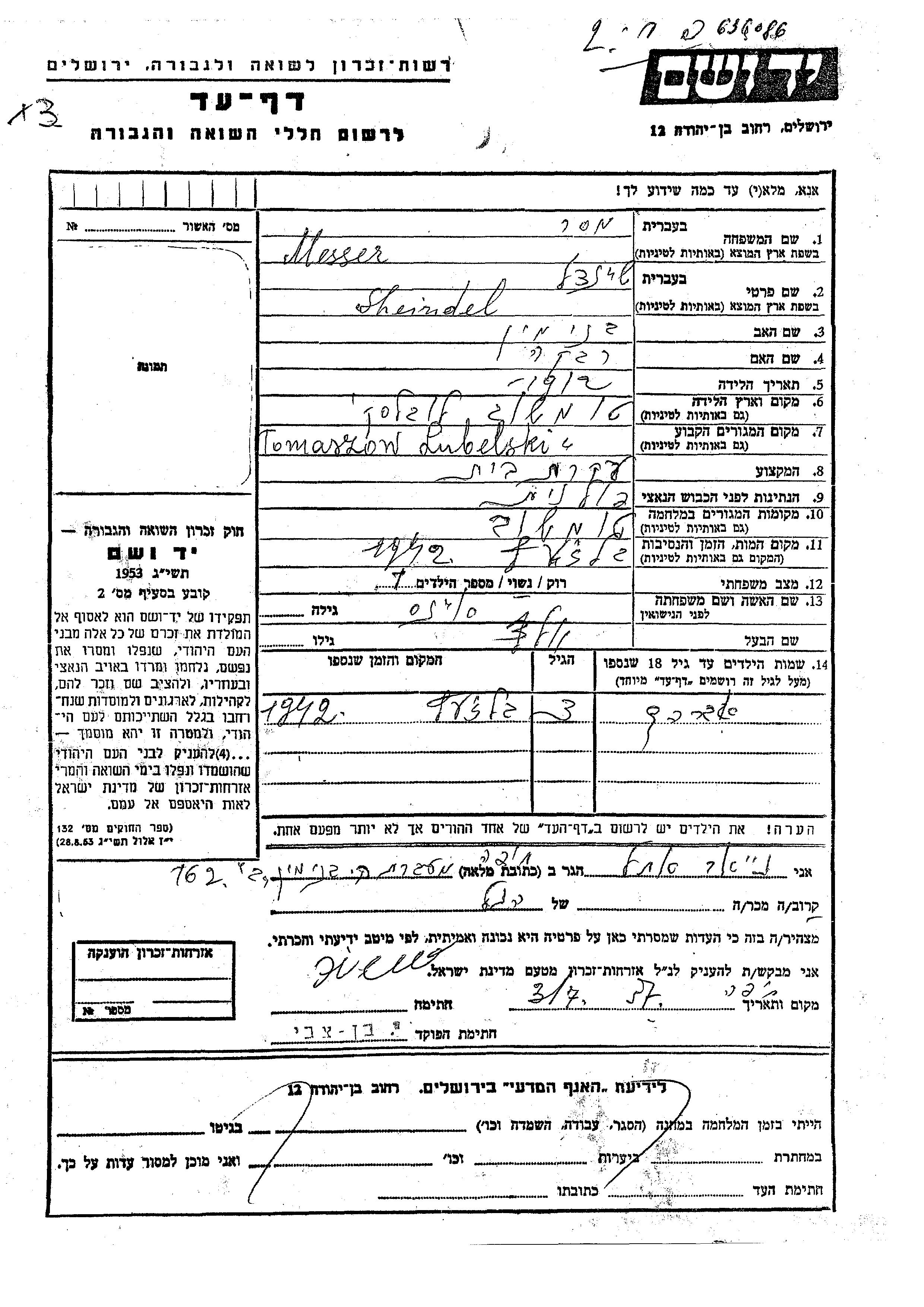 Messer Sheindl 1912 Tomaszow, Pologne Feuille de témoignage