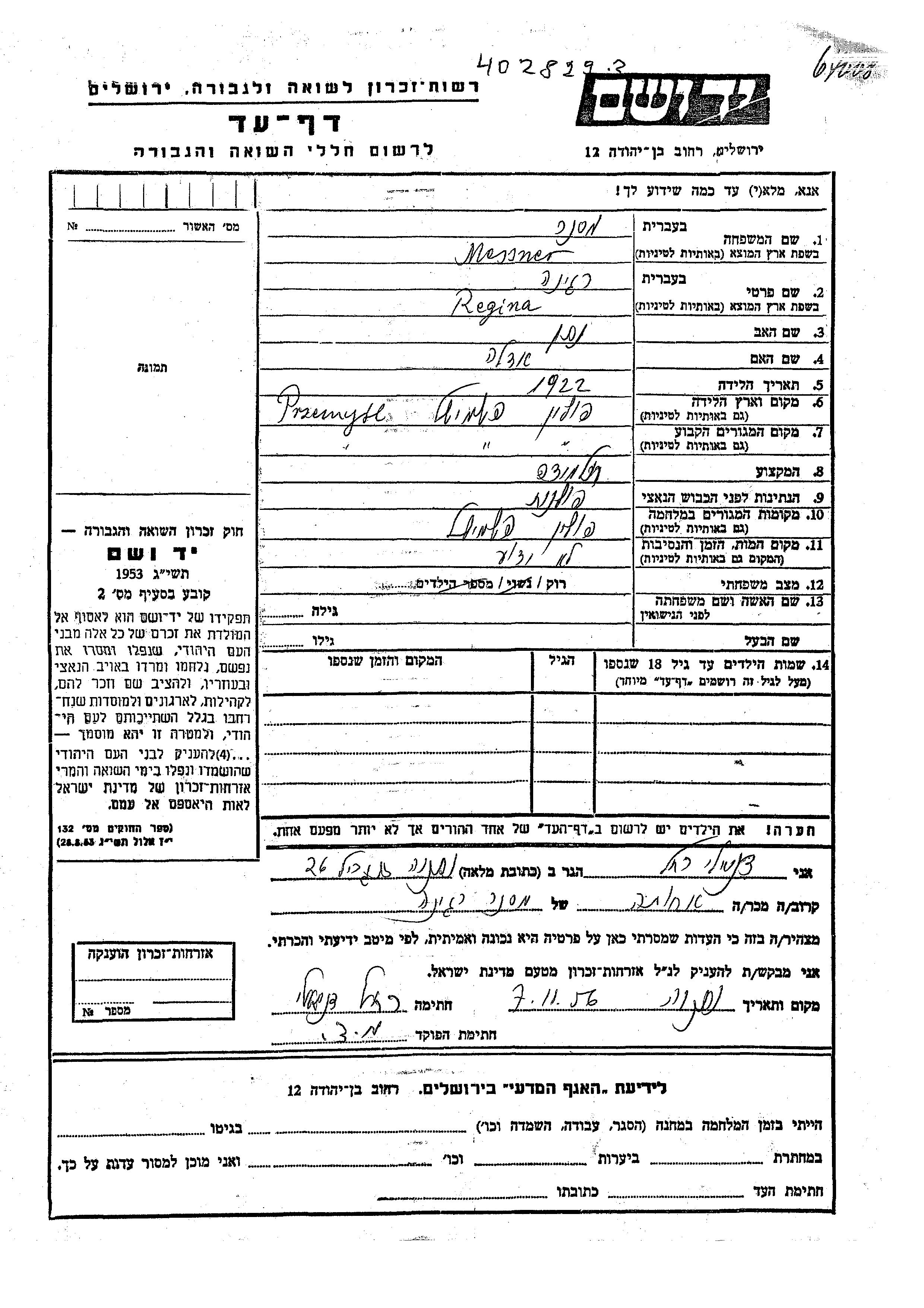 Messner Regina 1922 Przemysl, Pologne Feuille de témoignage