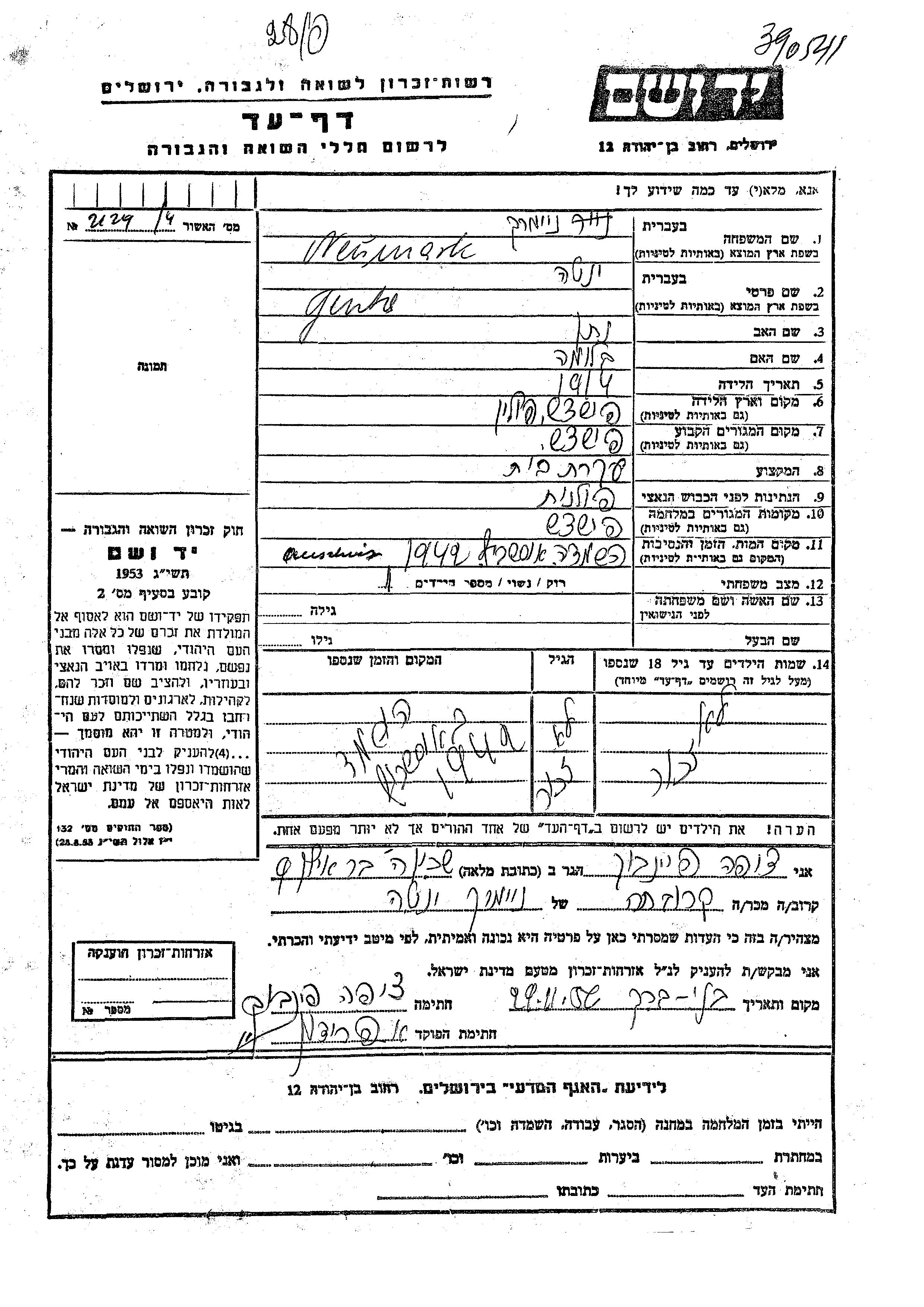 Yad Vashem - Pages of Testimony Names Memorial Collection