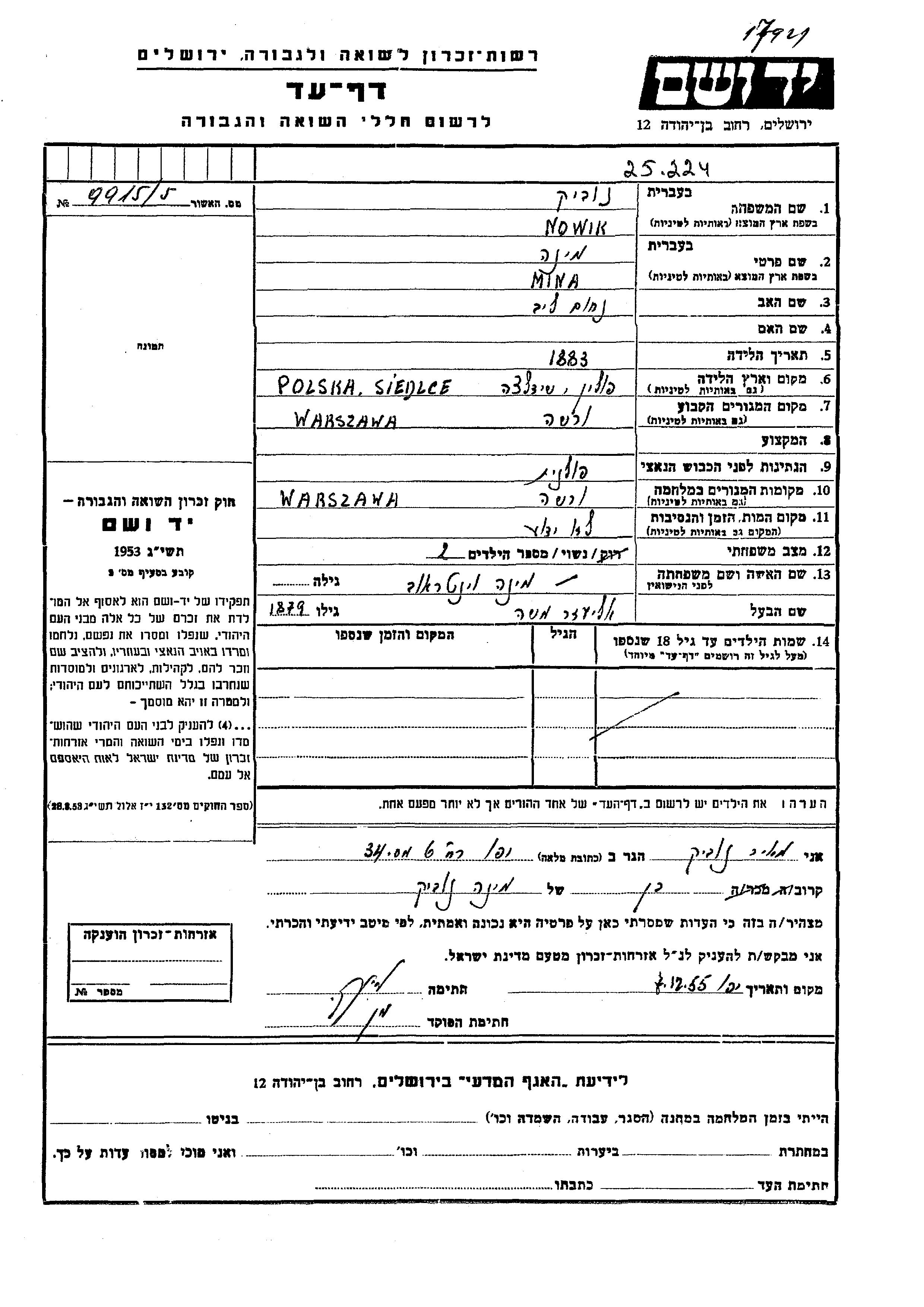 Mina Nowik née Veintraub est née à Siedlce, Pologne en 1883, fille de Nakhum Leib. Elle était Mariée à Eliezer Moshe. Avant la seconde guerre mondiale elle vivait à Warszawa, Pologne. Pendant la guerre, elle était à Warszawa, Pologne.