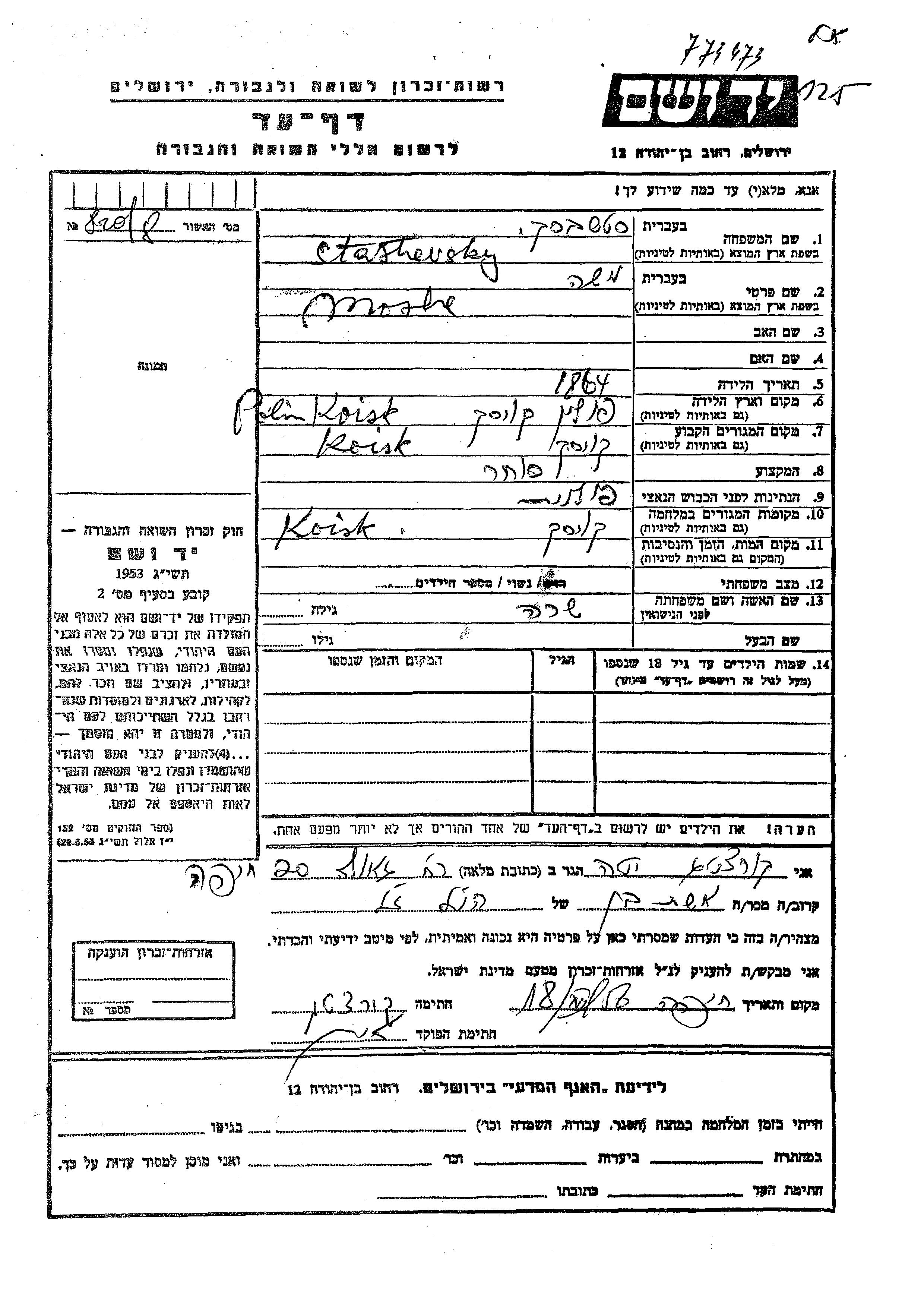 Stashevsky Moshe 1864 Koiskie, Pologne Feuille de témoignage