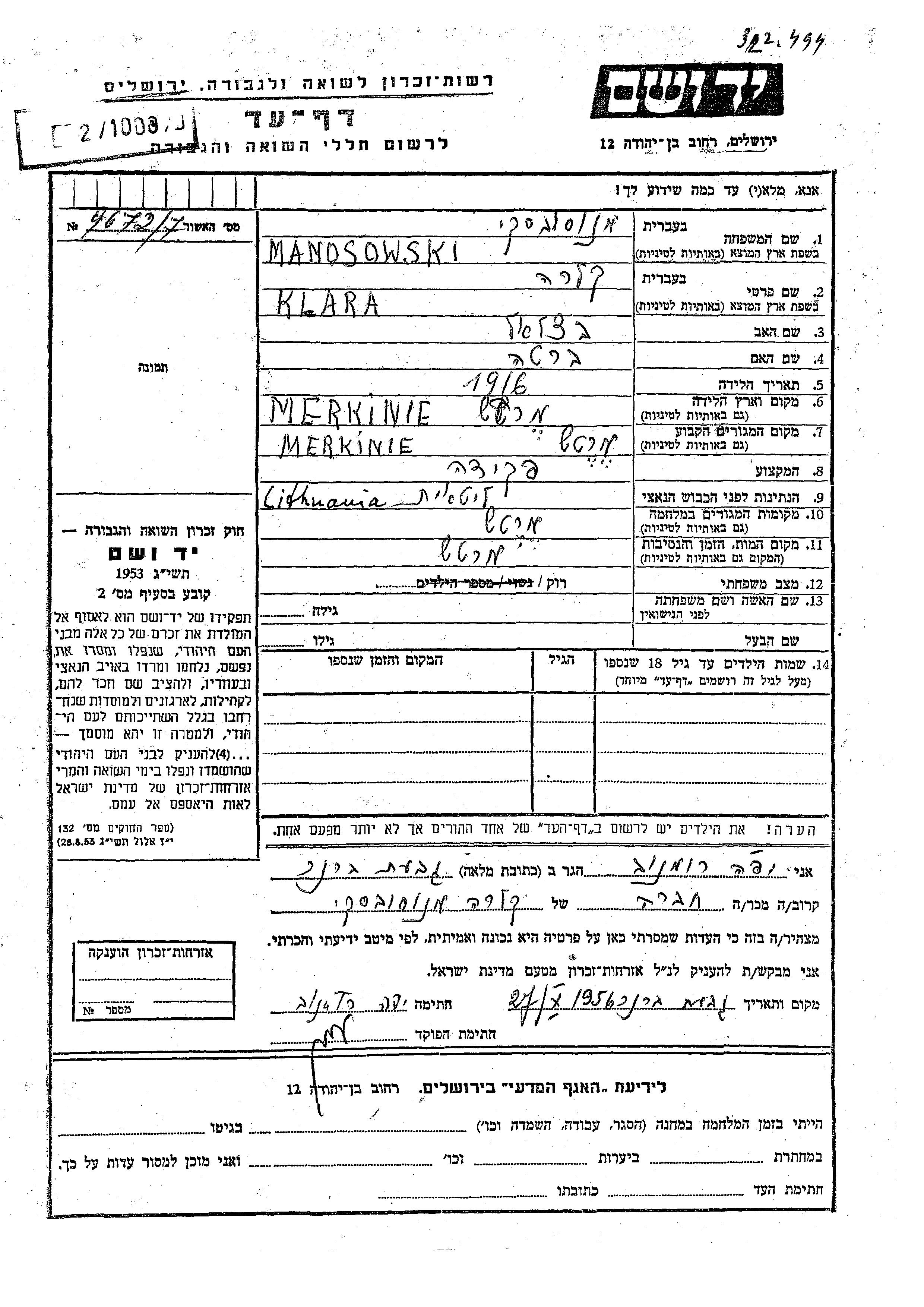 Manosowski Klara 1916 Merkinė, Lituanie Feuille de témoignage