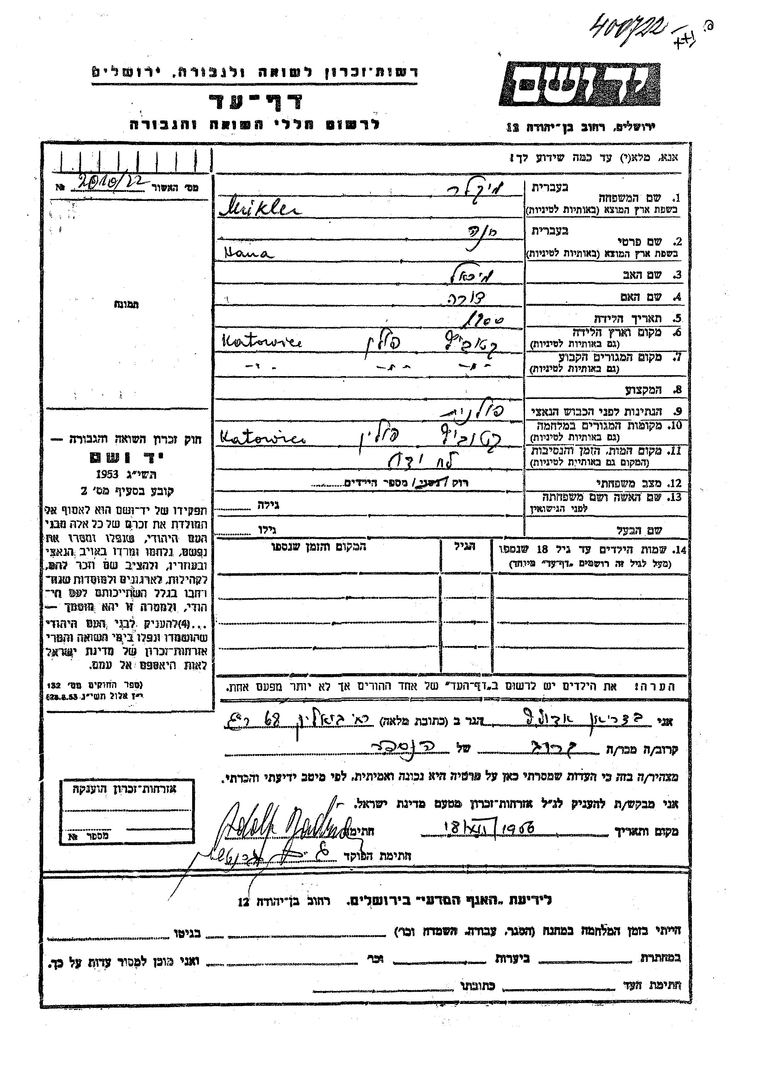 Mikler Hana 1900 Katowice, Pologne Feuille de témoignage
