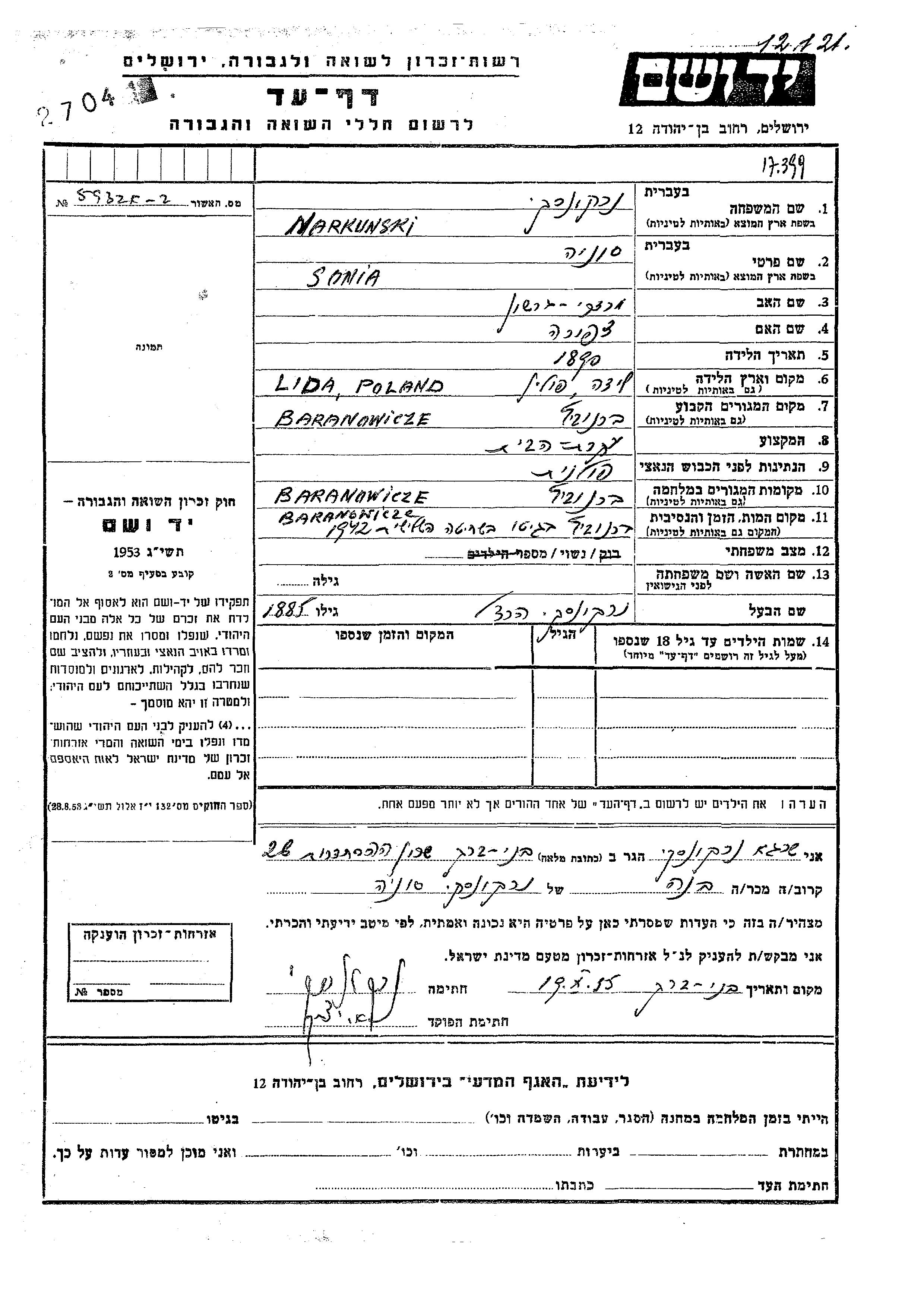 Sonia Narkunski est née à Lida, Pologne en 1890, fille de Mordekhai Gershon et de Tzipora. Elle était Femme au foyer et Mariée à Hertzel. Avant la seconde guerre mondiale elle vivait à Baranowicze, Pologne. Pendant la guerre, elle était à Baranowicze, Pologne.