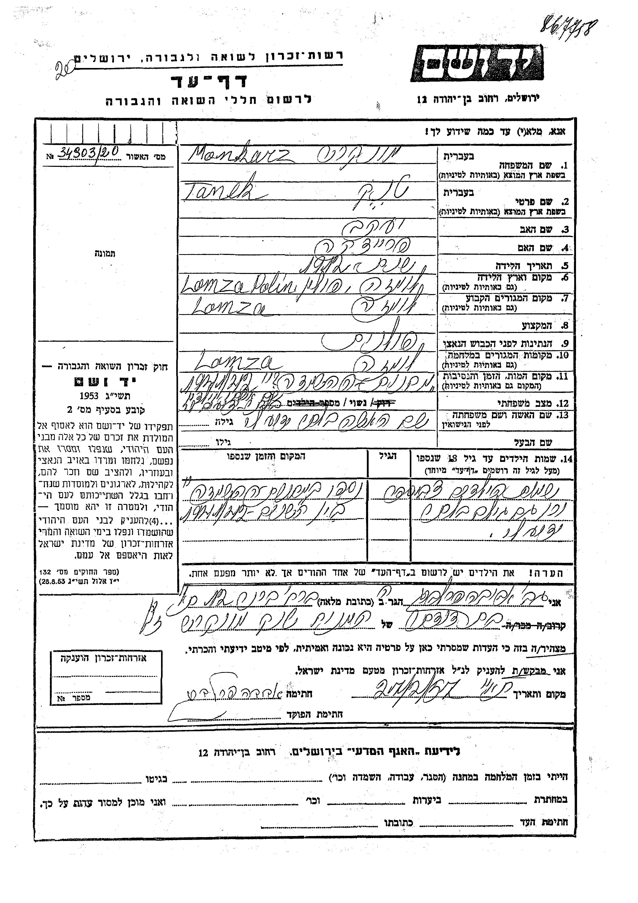 Tanek Monkarz est né à Łomża, Pologne en 1912, fils de Yaakov et de Freidka. Il était Marié. Avant la seconde guerre mondiale il vivait à Łomża, Pologne. Au cours de la guerre, il était à Łomża, Pologne.