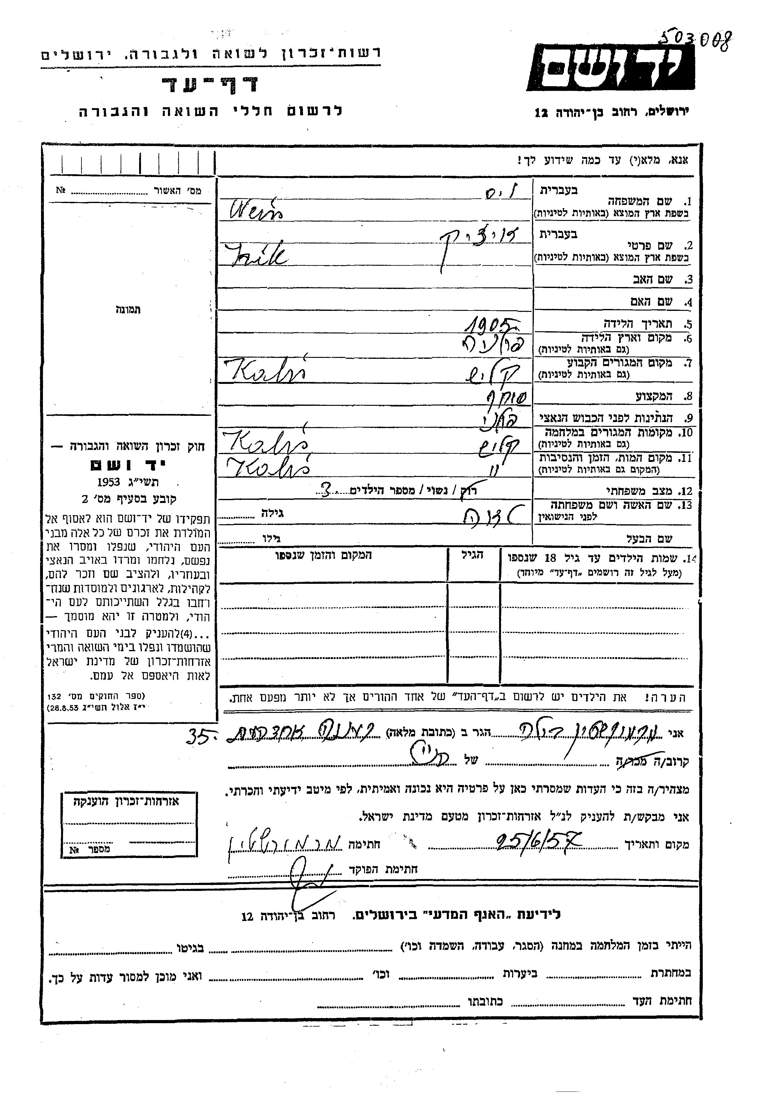 Weiss Yzik Itzik 1905 Kalisz, Pologne Feuille de témoignage