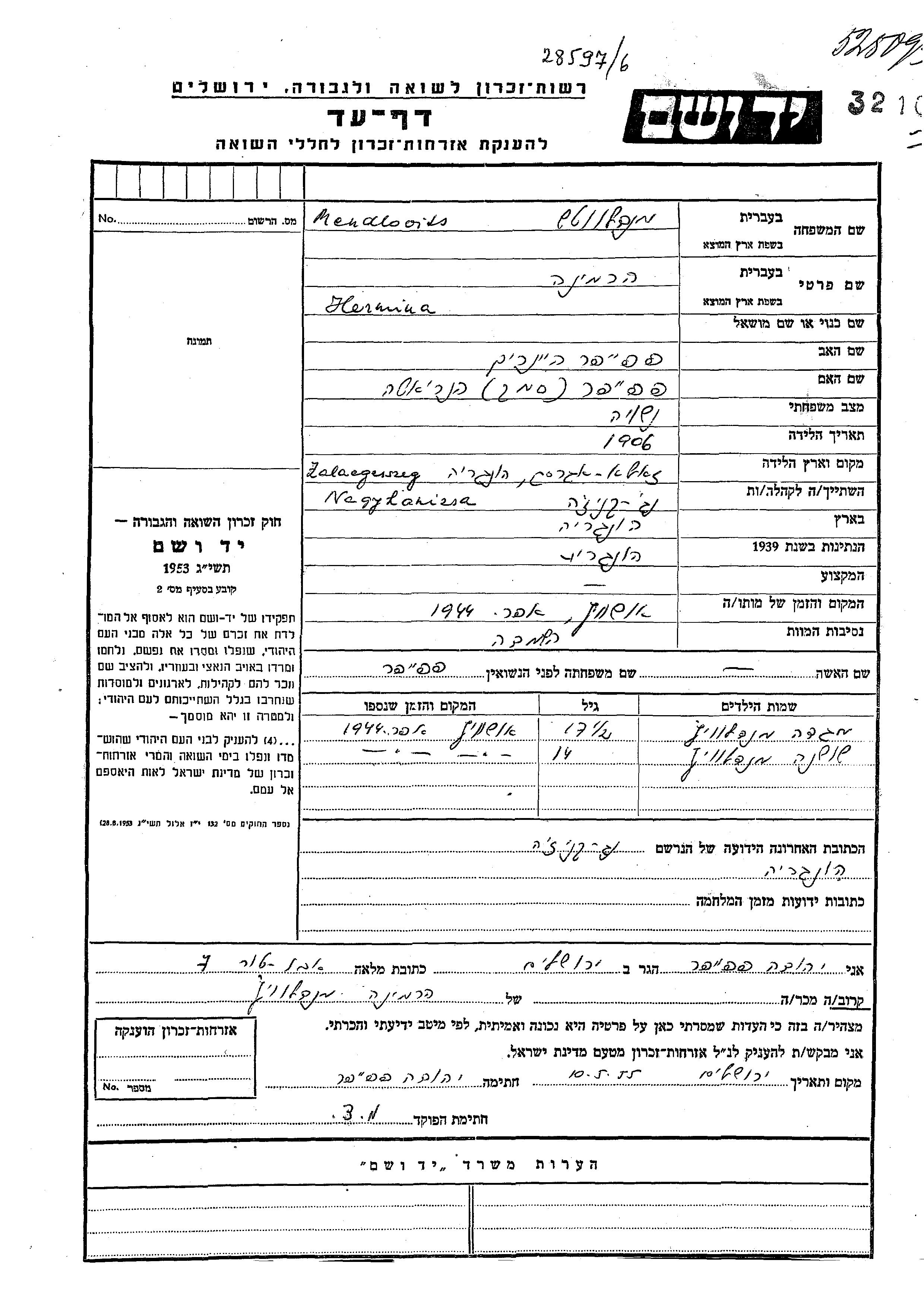 Mendlovits Hermina 1906 Nagykanizsa, Hongrie Feuille de témoignage