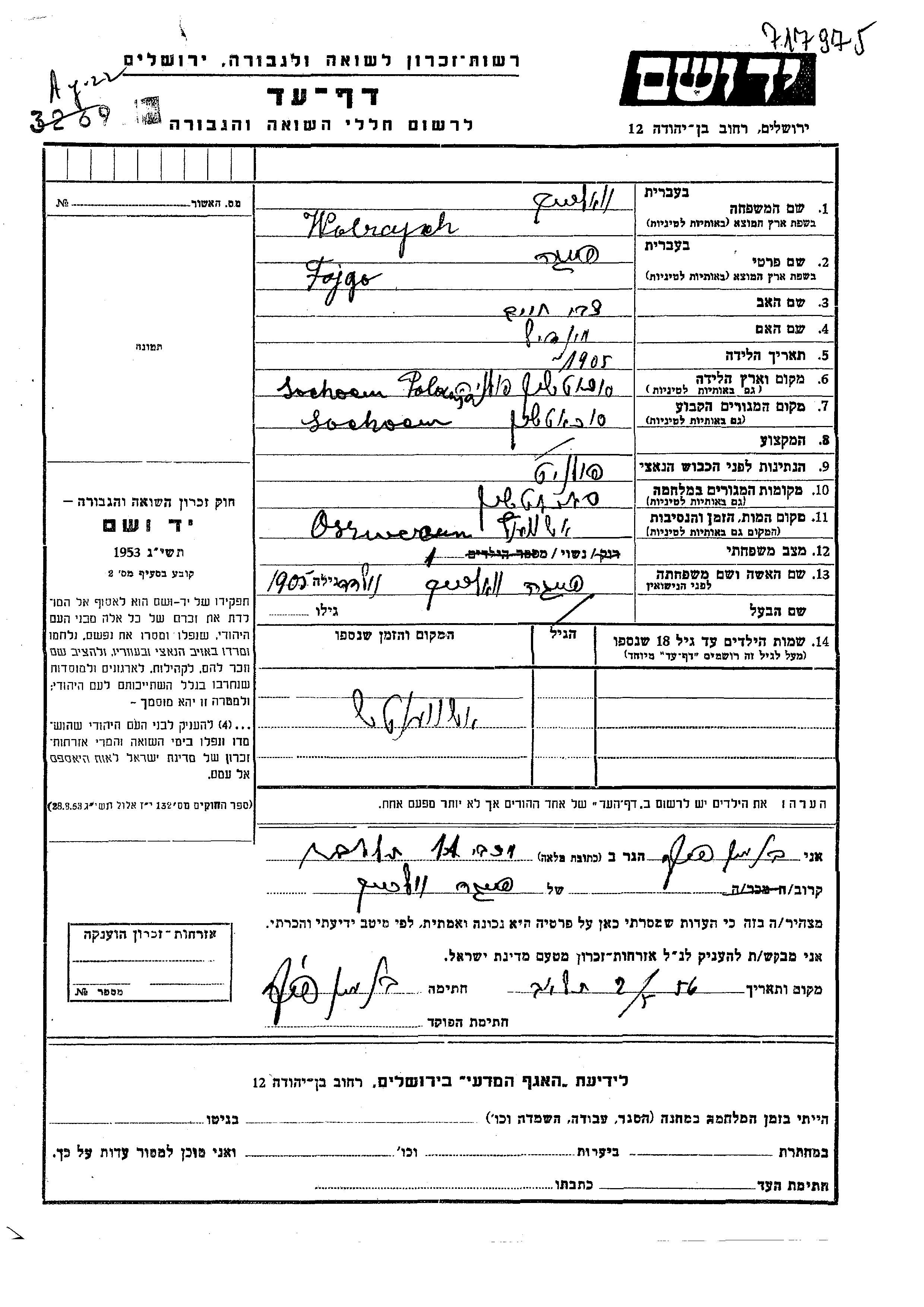 Fajga Wolrajch est née à Sochocin, Pologne en 1905, fille de Tzvi Khaim et de Mindil. Elle était Mariée. Avant la seconde guerre mondiale elle vivait à Sochocin, Pologne. Pendant la guerre, elle était à Sochocin, Pologne.