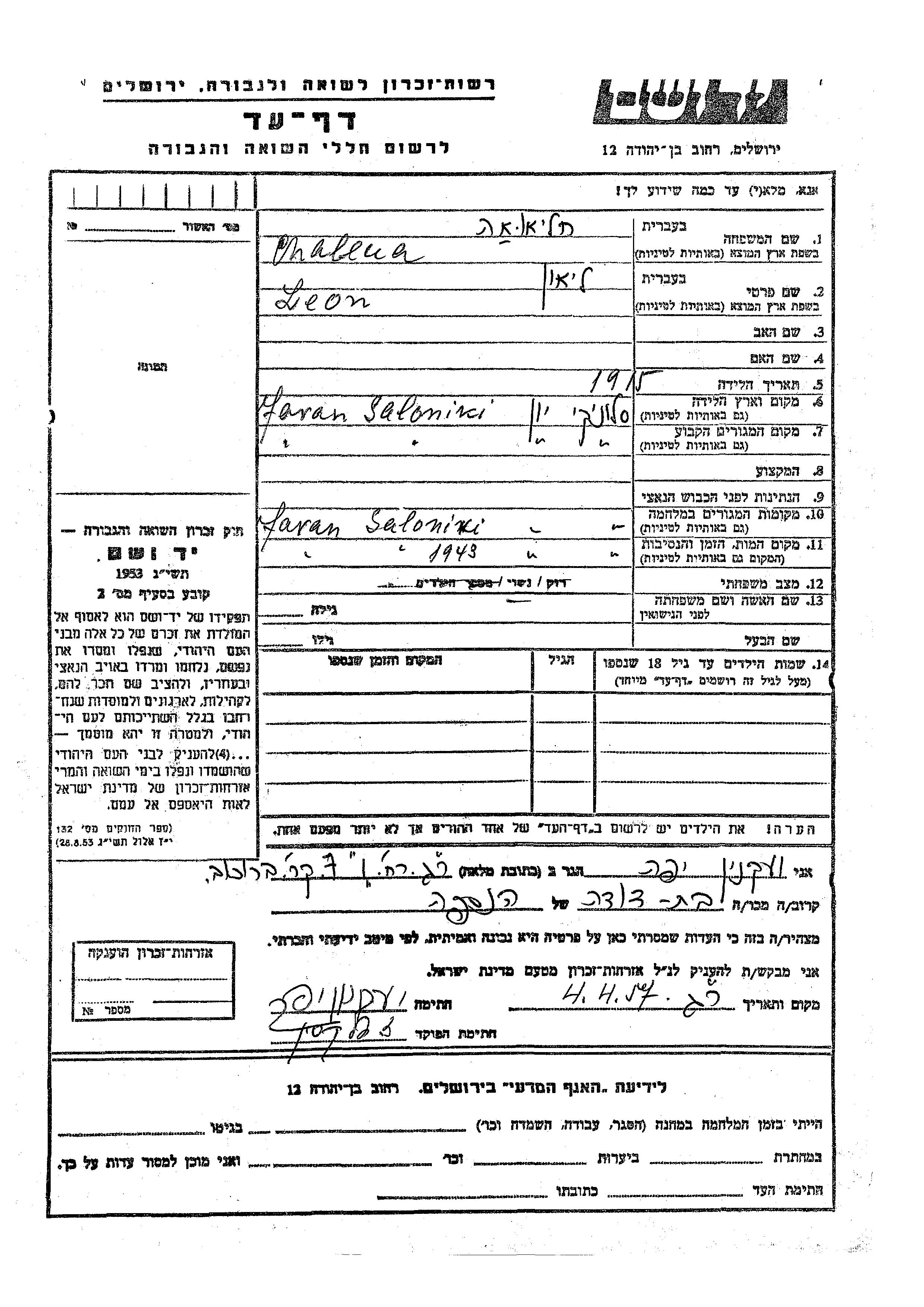 Lion Chaleua est né à Saloniki, Grèce en 1915. Il était Marié. Avant la seconde guerre mondiale il vivait à Saloniki, Grèce. Au cours de la guerre, il était à Saloniki, Grèce.