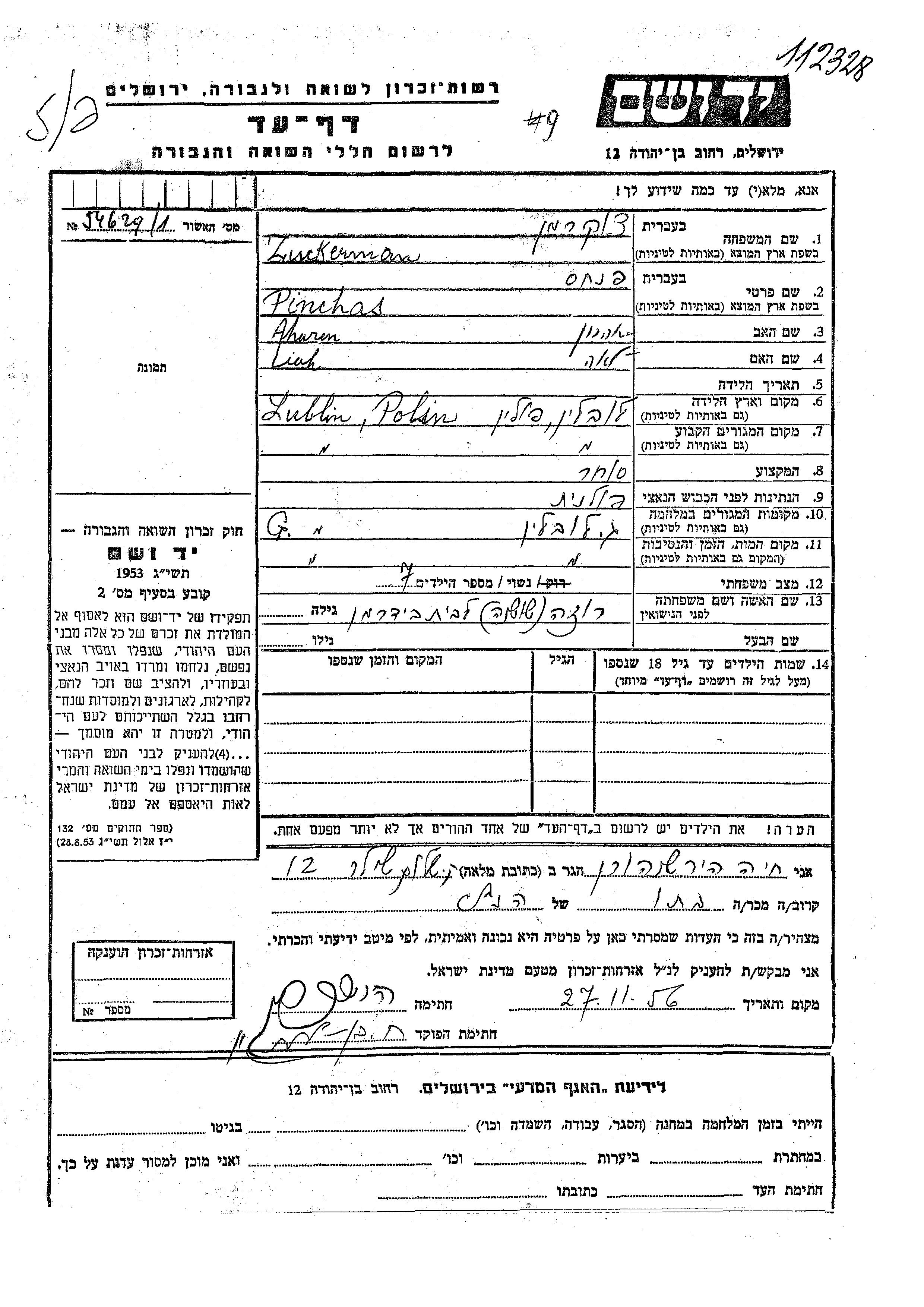 Zukerman Pinchas Lublin, Pologne Feuille de témoignage