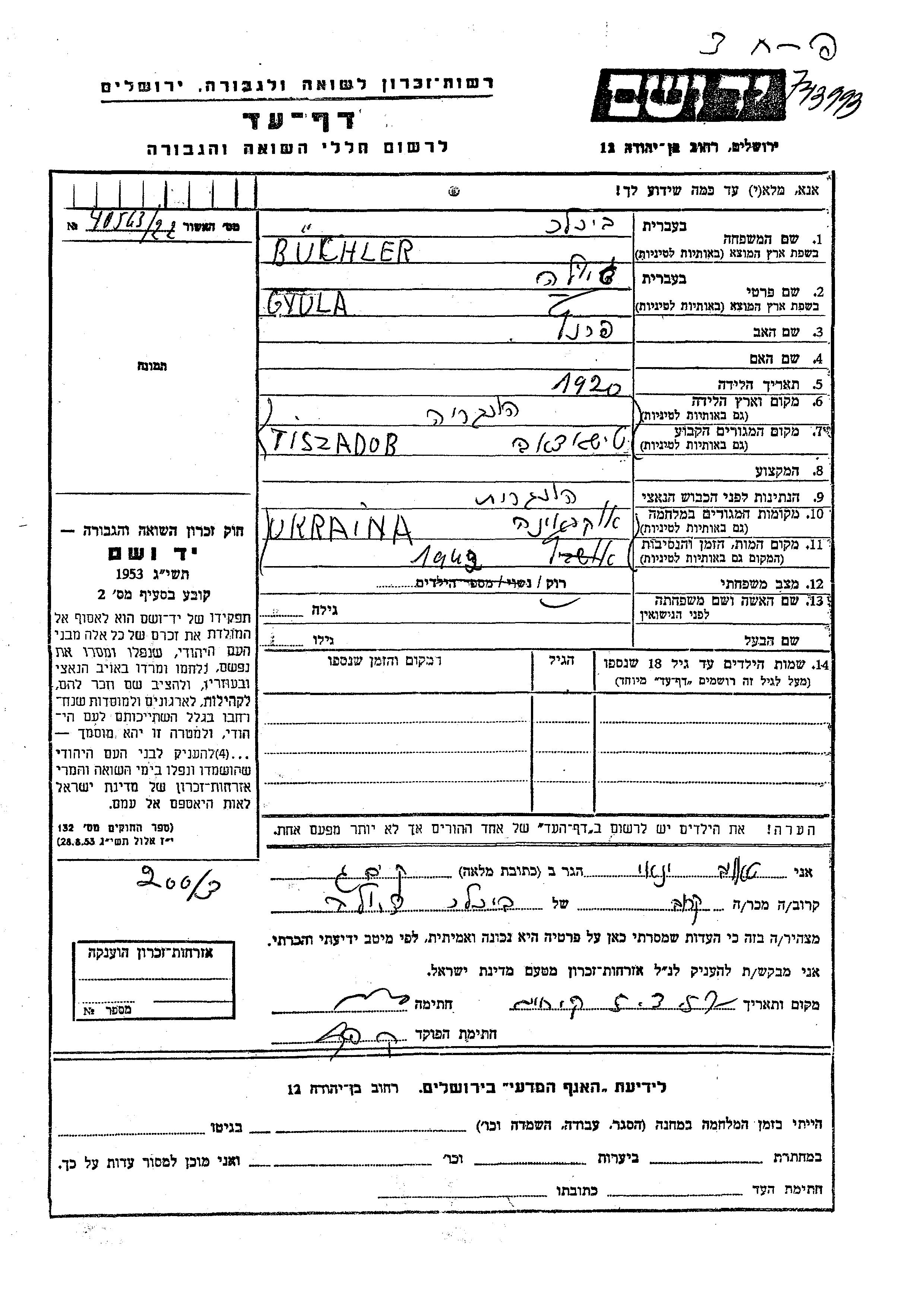 Yad Vashem - Pages of Testimony Names Memorial Collection