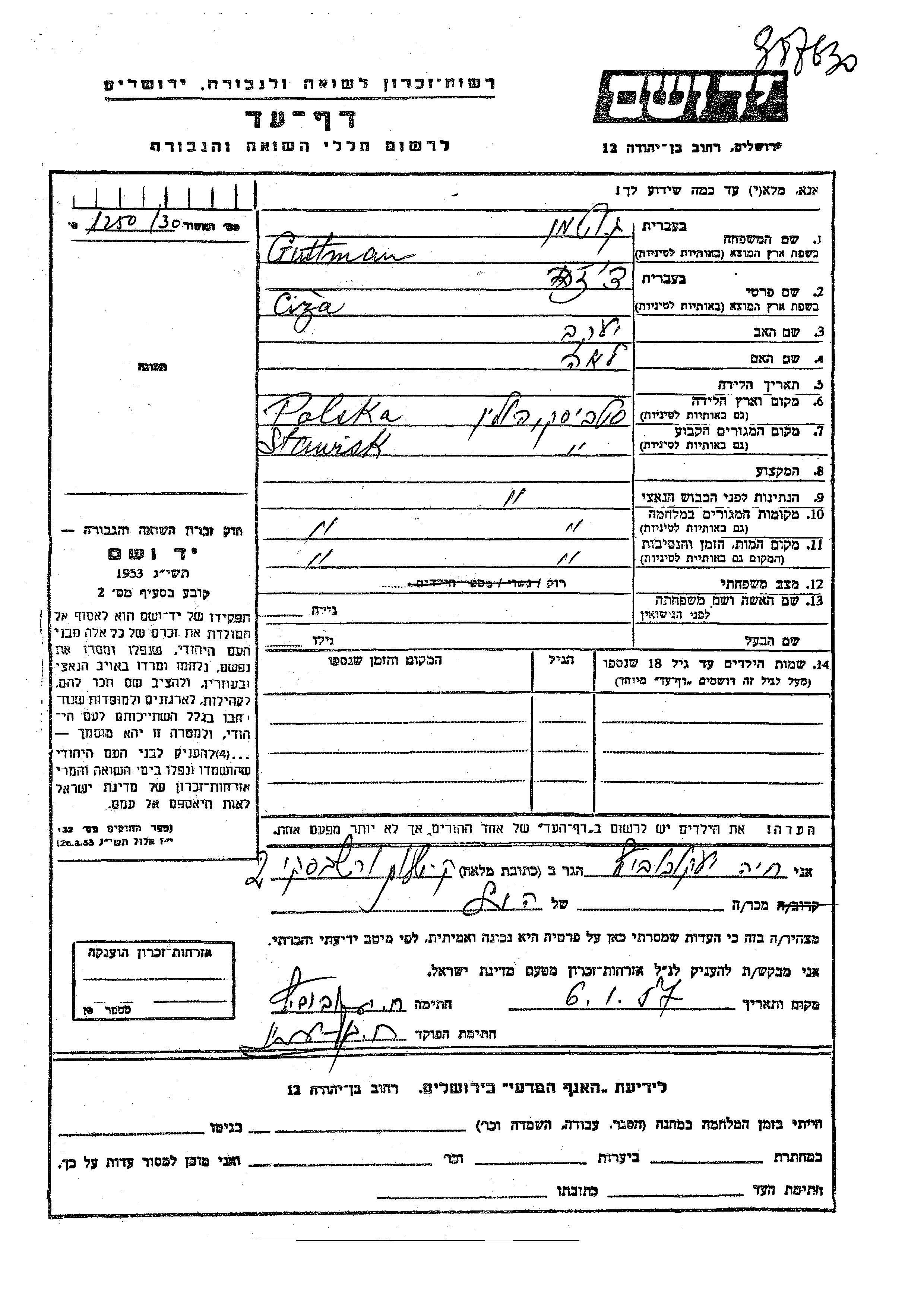 Guttman Ciza Stawiski, Pologne Feuille de témoignage
