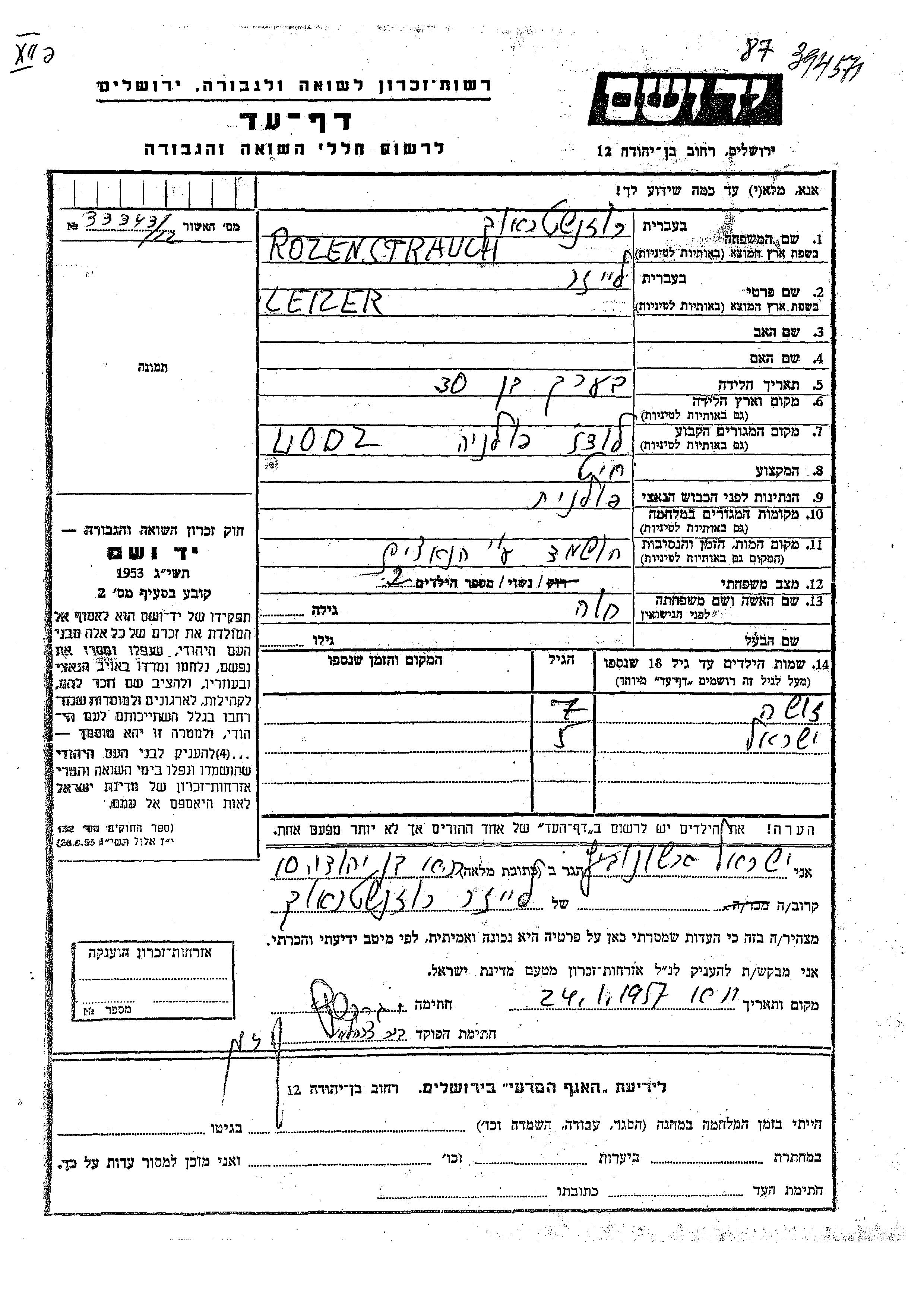 Rozenstrauch Leizer Lodz, Pologne Feuille de témoignage