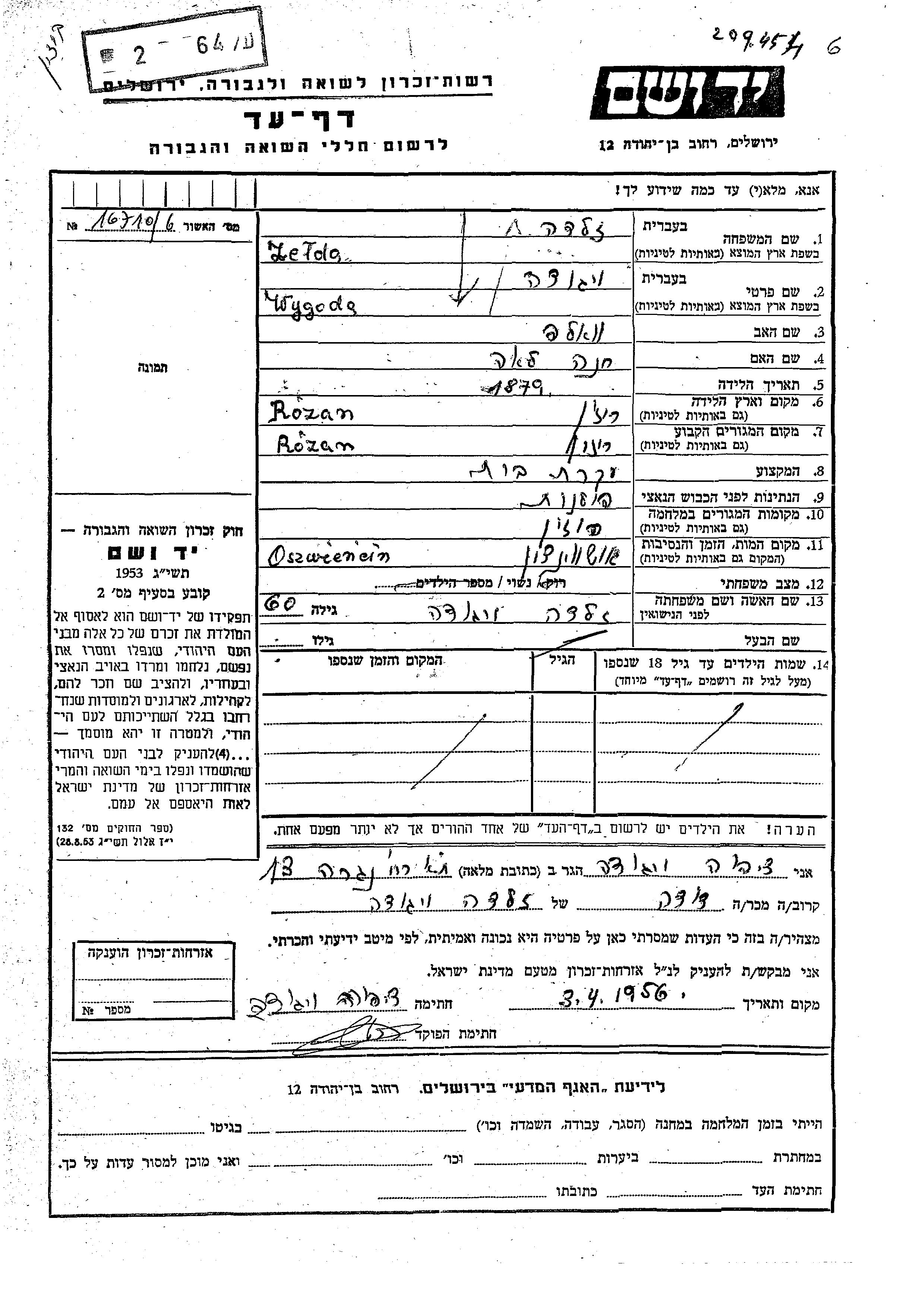 Zelda Wygoda née Vigoda est née à Rozan, Pologne en 1879, fille de Volf et de Khana Lea. Elle était Femme au foyer et Mariée. Avant la seconde guerre mondiale elle vivait à Rozan, Pologne. Pendant la guerre, elle était à Rozan, Pologne.