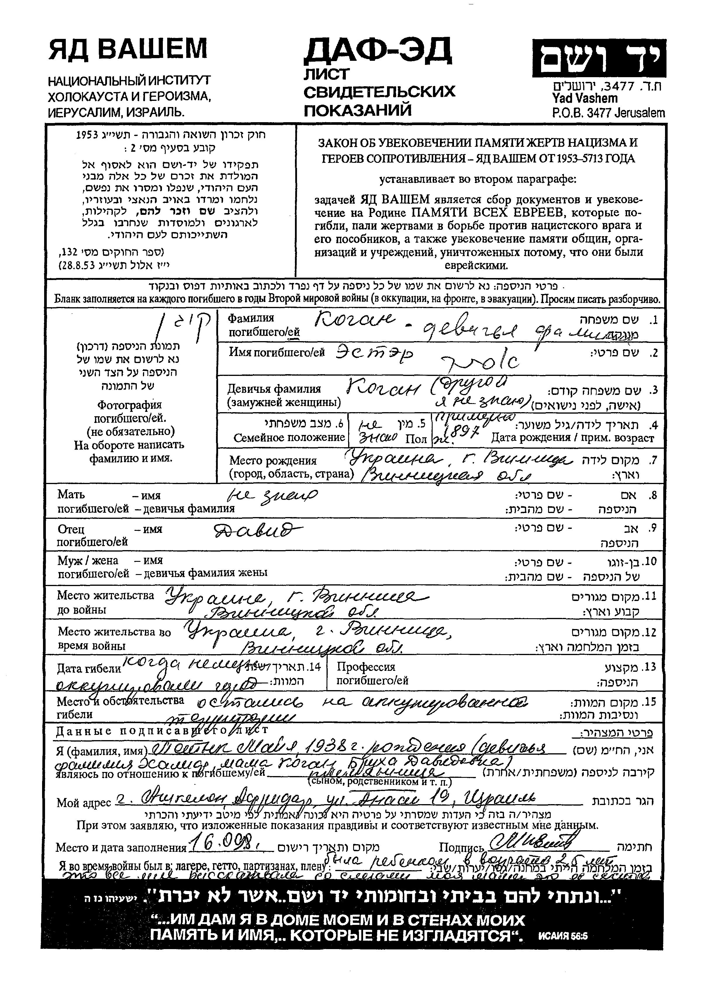 Kogan Ester 1897 Vinnitsa, Ukraine (URSS) Feuille de témoignage