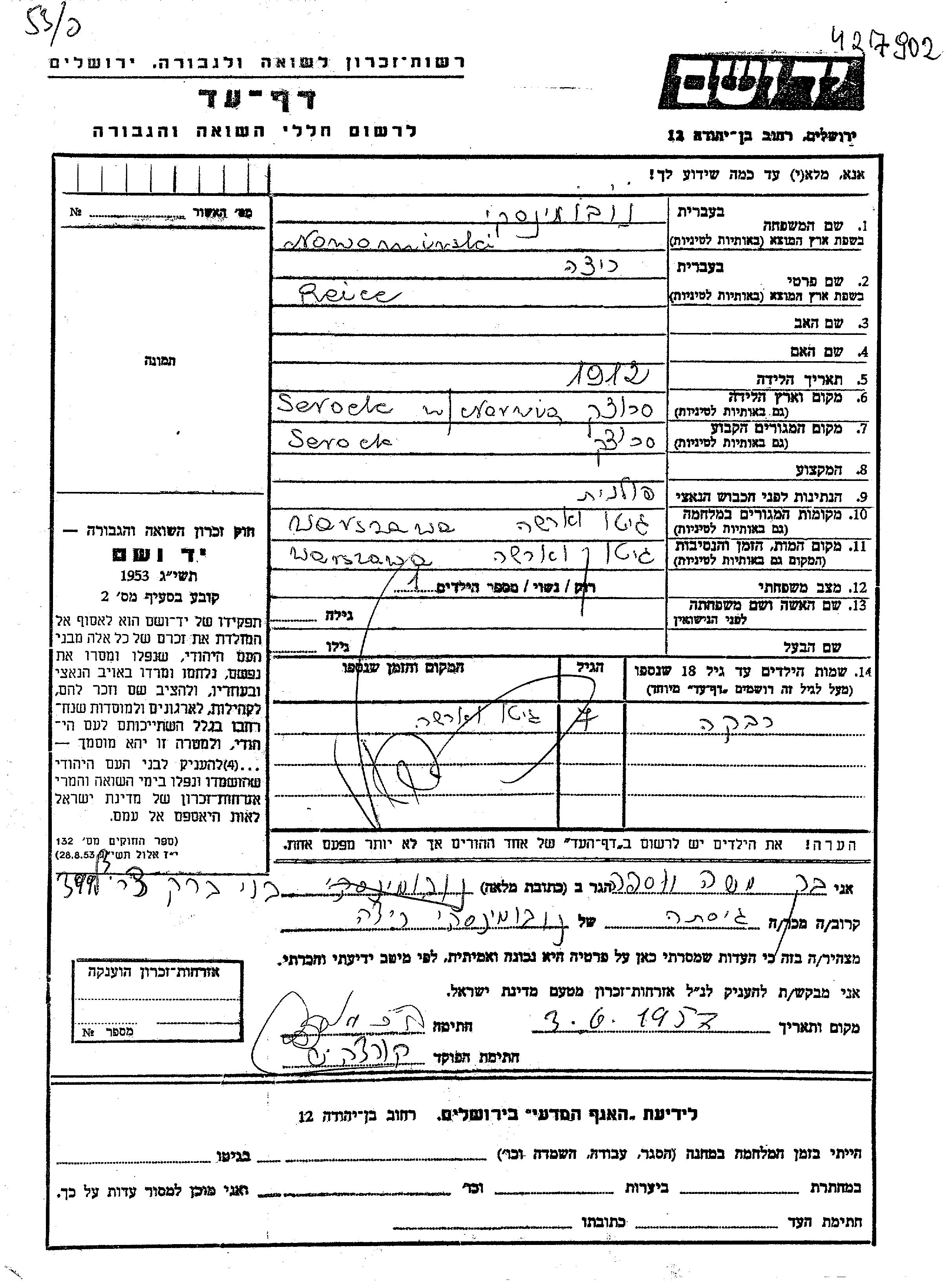 Reice Nowominski est née à Serock, Pologne en 1912. Elle était Mariée. Avant la seconde guerre mondiale elle vivait à Serock, Pologne. Pendant la guerre, elle était à Warszawa, Pologne.