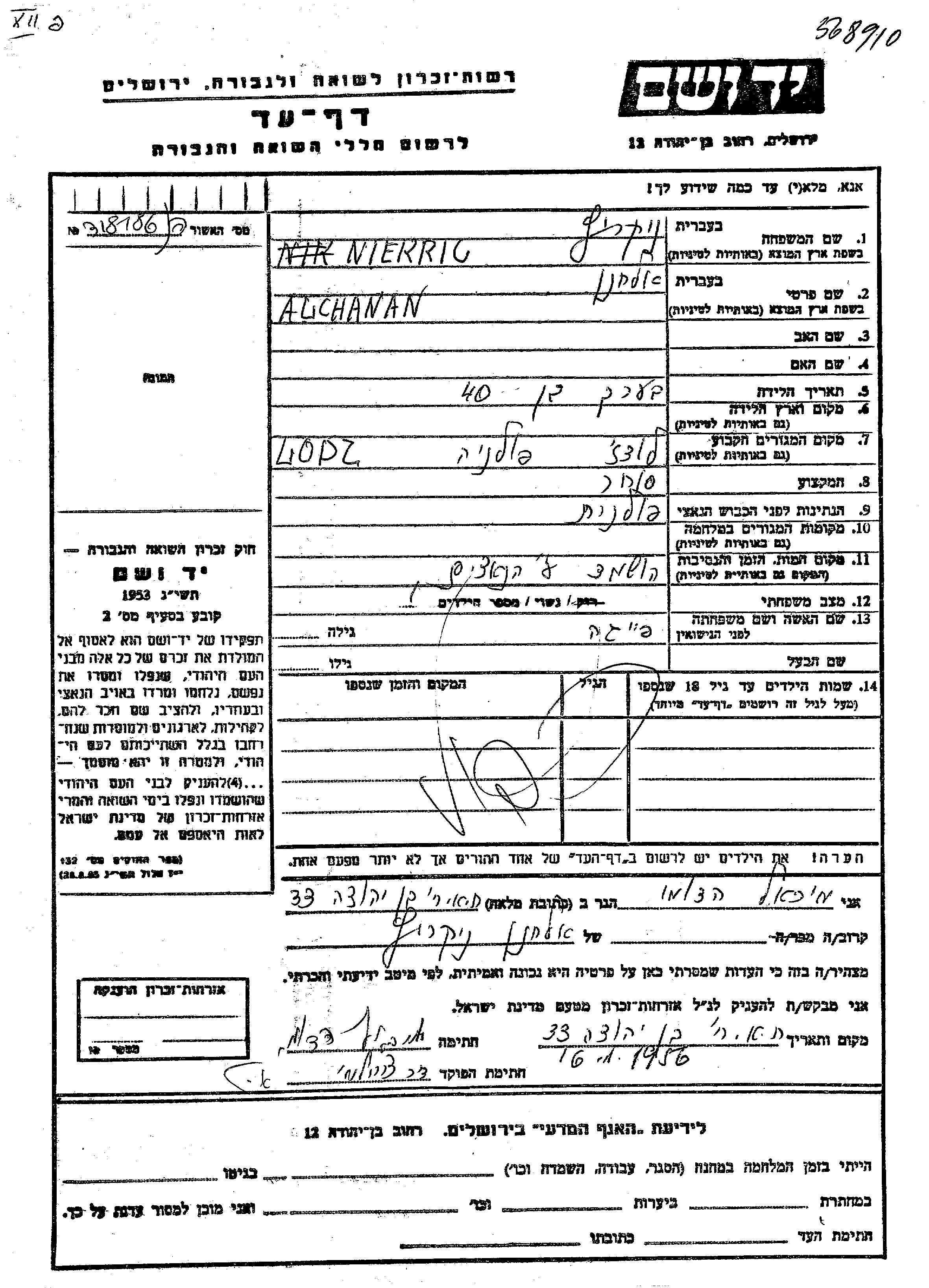 Niekric Alchanan Lodz, Pologne Feuille de témoignage