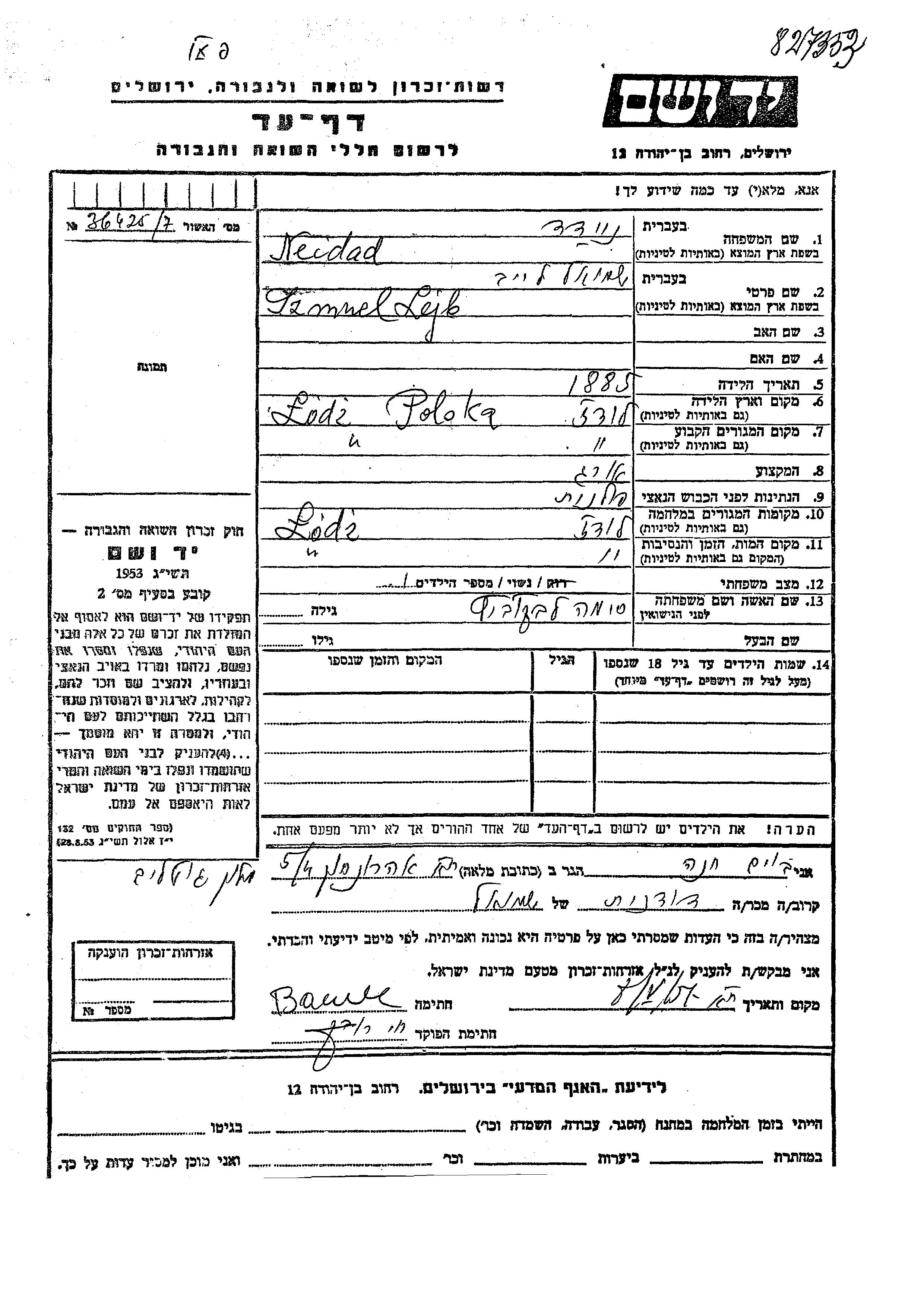 Neidad Szmuel Lejb 1885 Lodz, Pologne Feuille de témoignage